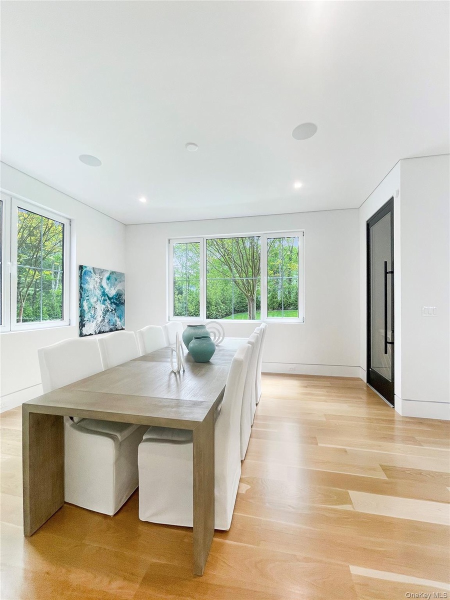 - Kitchen featuring light wood finished floors, plenty of natural light, white cabinetry, open floor plan, and recessed lighting