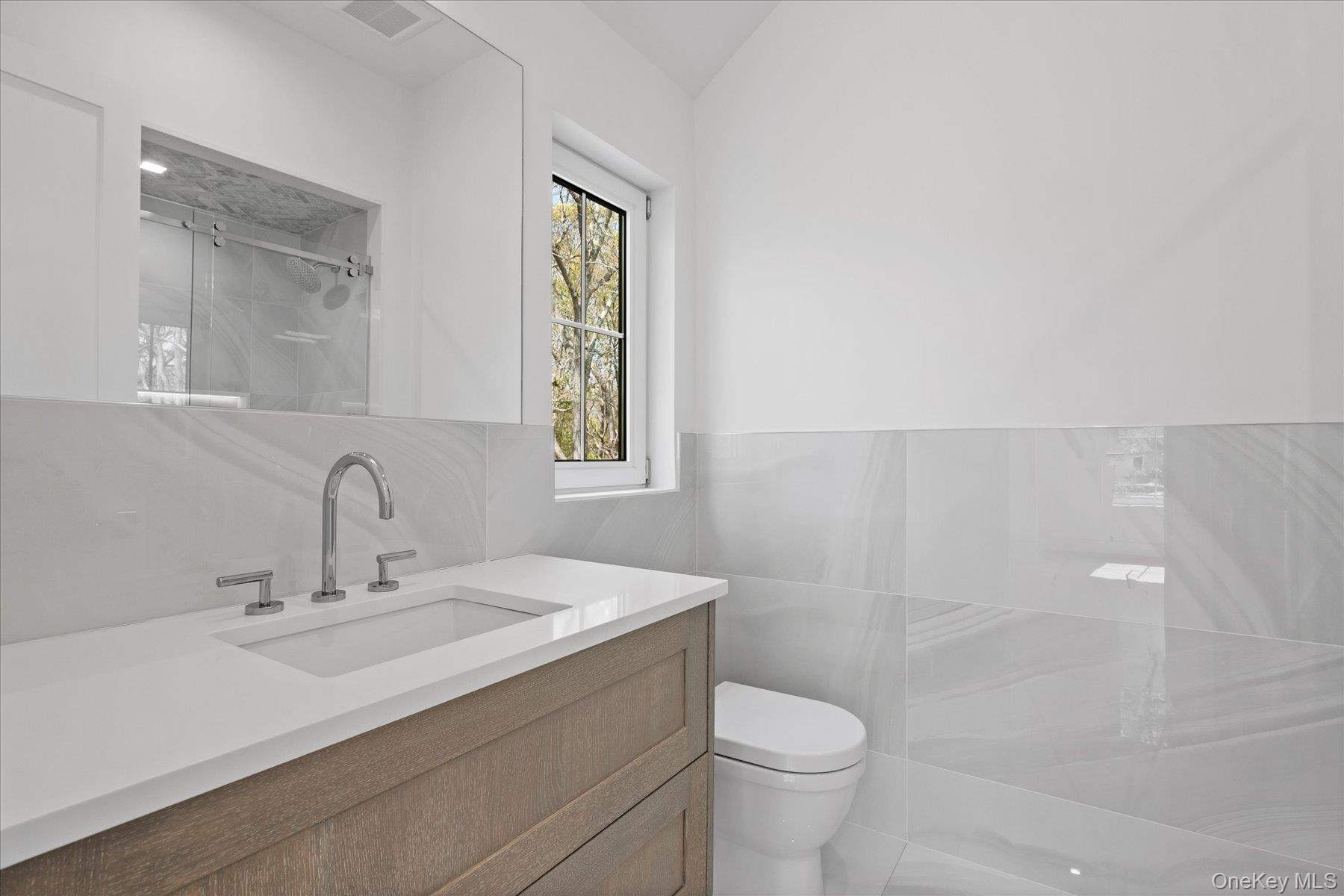- Full bath featuring toilet, a walk in shower, tile walls, visible vents, and vanity