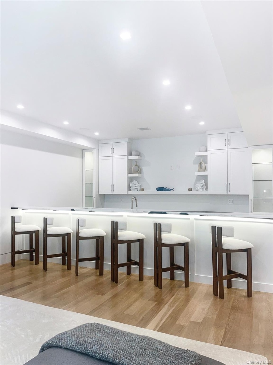- Kitchen featuring open shelves, a breakfast bar area, white cabinets, and recessed lighting