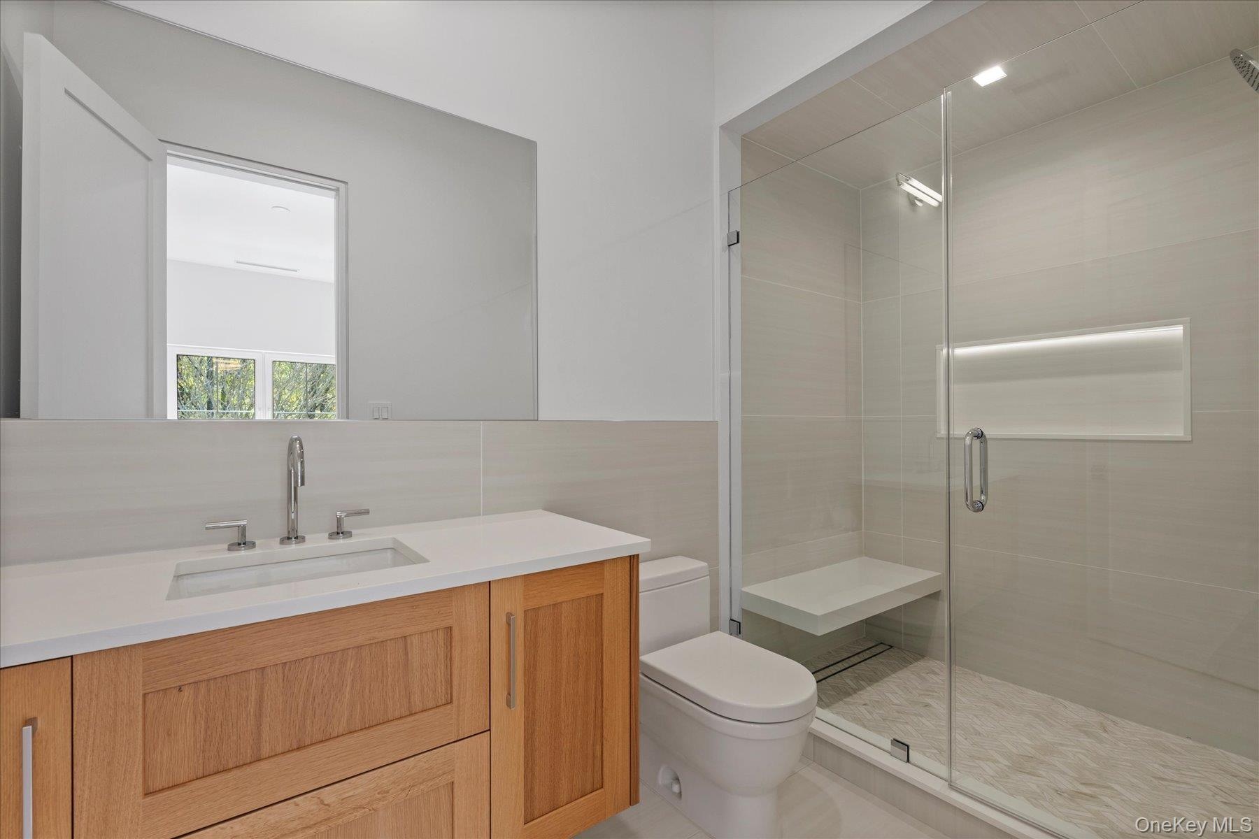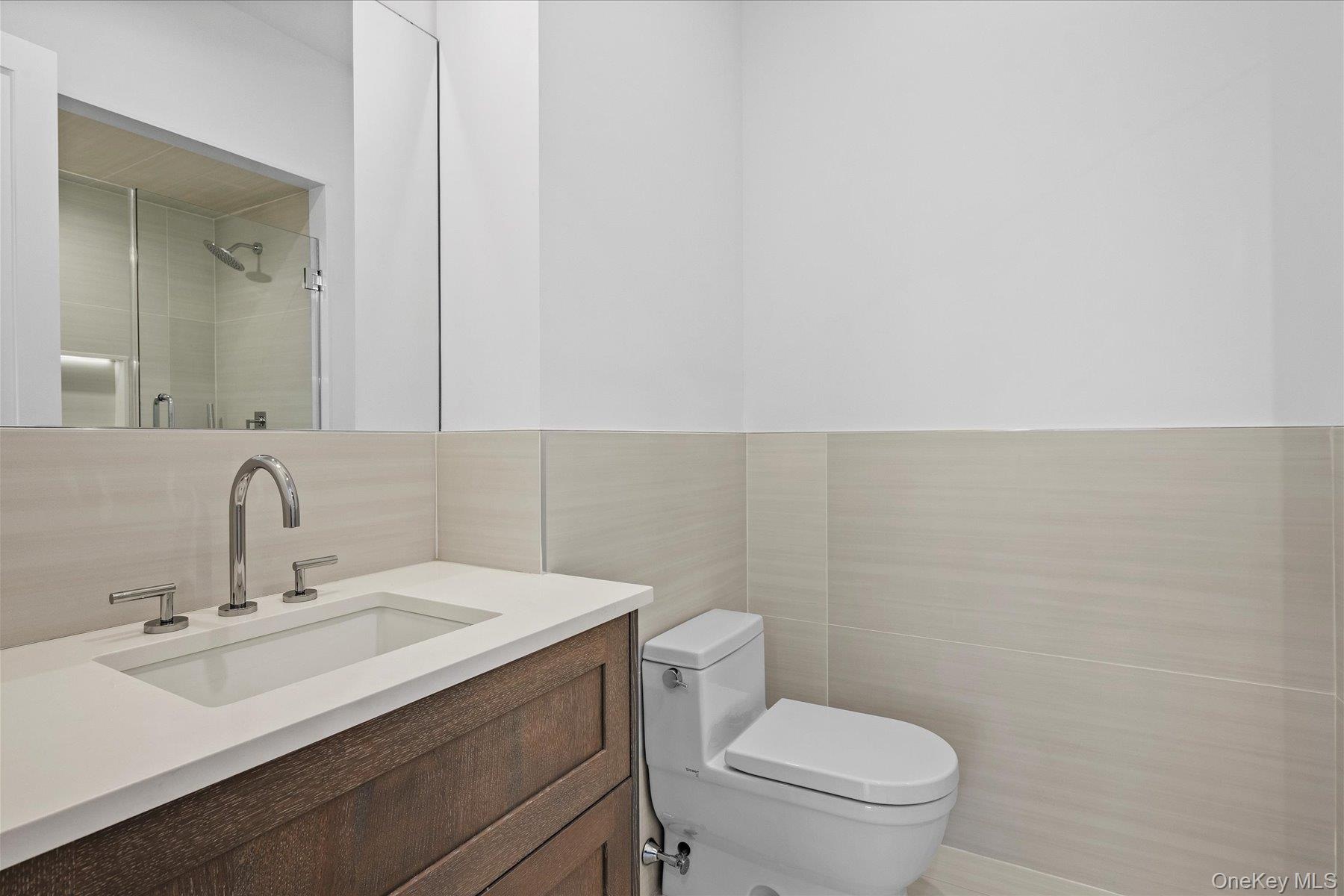 - Bathroom featuring vanity, toilet, tile walls, and a shower stall