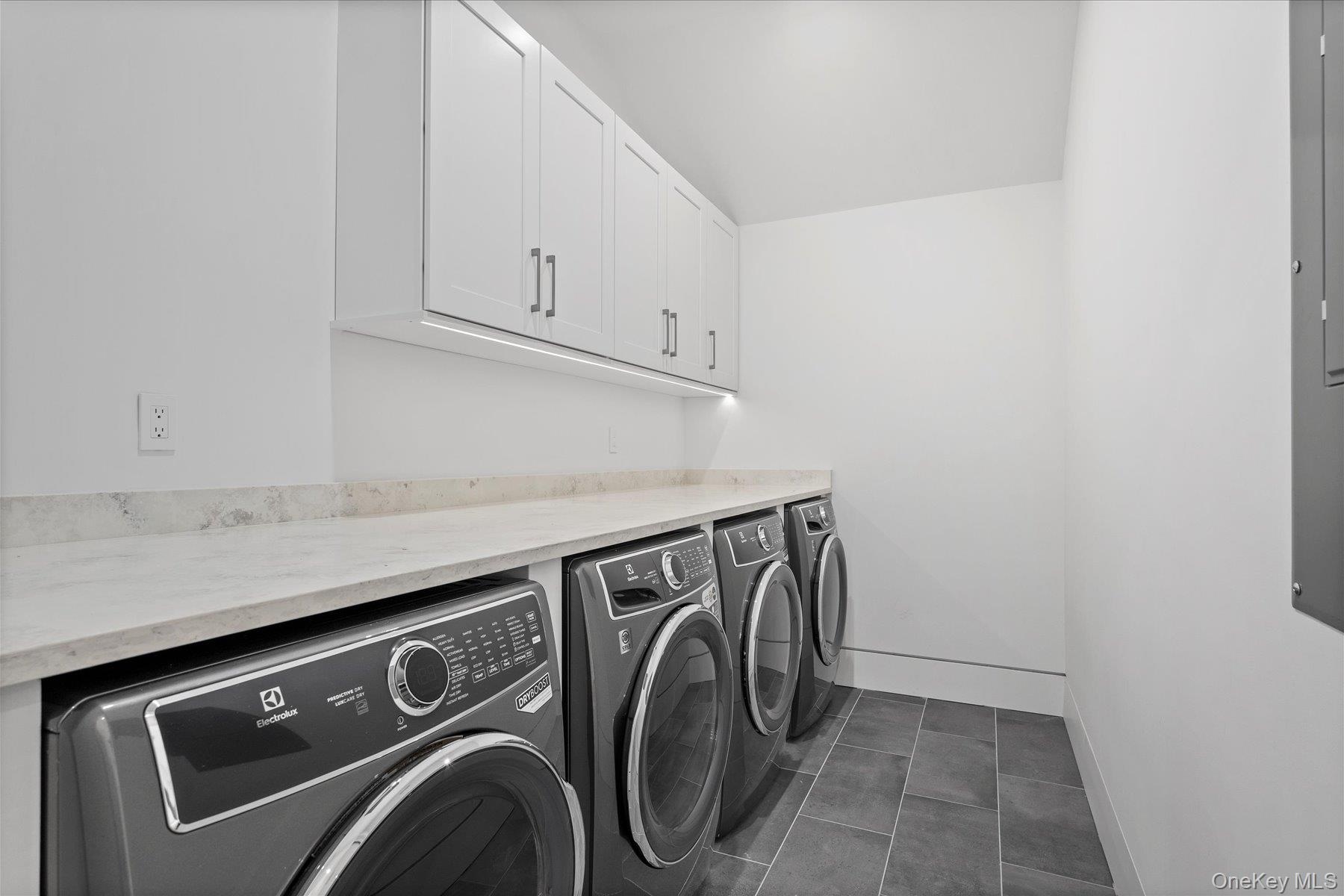 - Laundry room featuring washer and dryer, cabinet space, dark tile patterned floors, and baseboards
