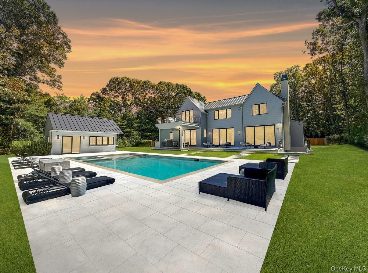 - Pool at dusk with a lawn, a balcony, a patio area, an outdoor pool, and an outbuilding