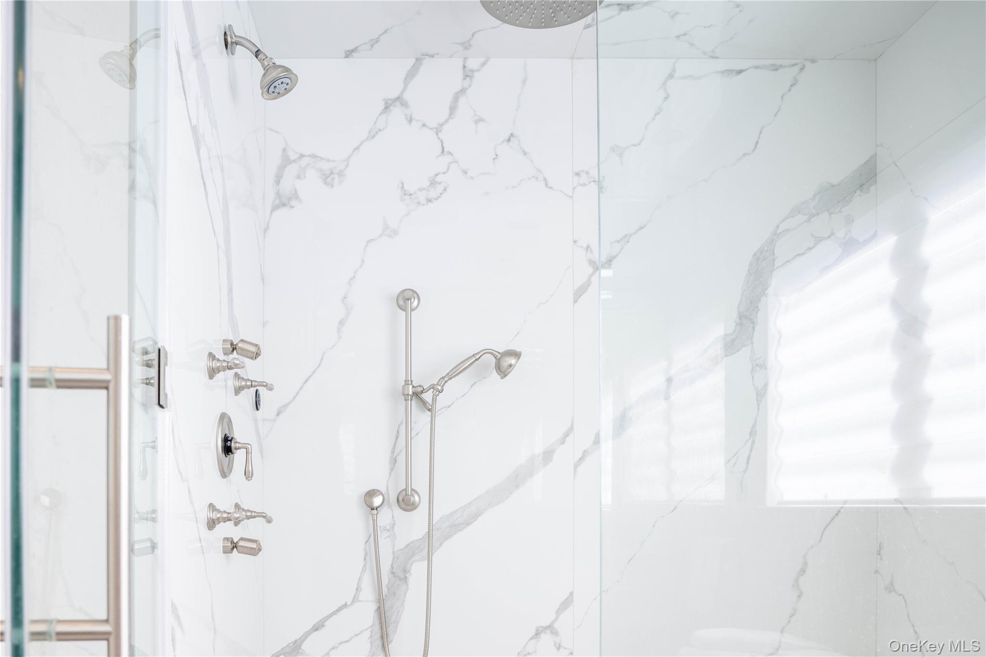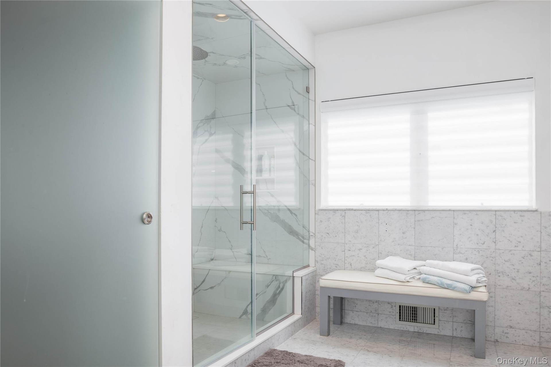 - Full bathroom featuring a marble finish shower, a wealth of natural light, and visible vents