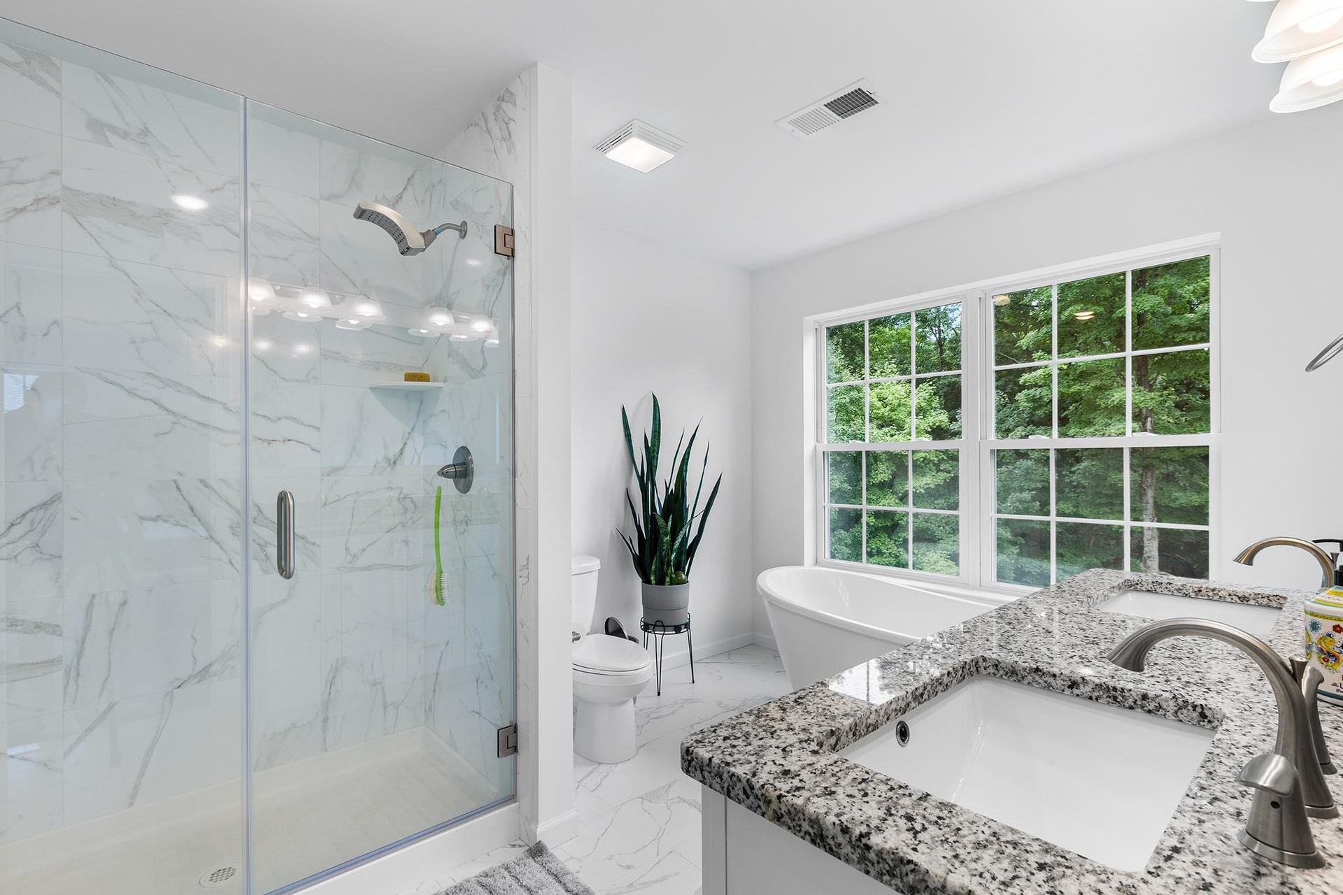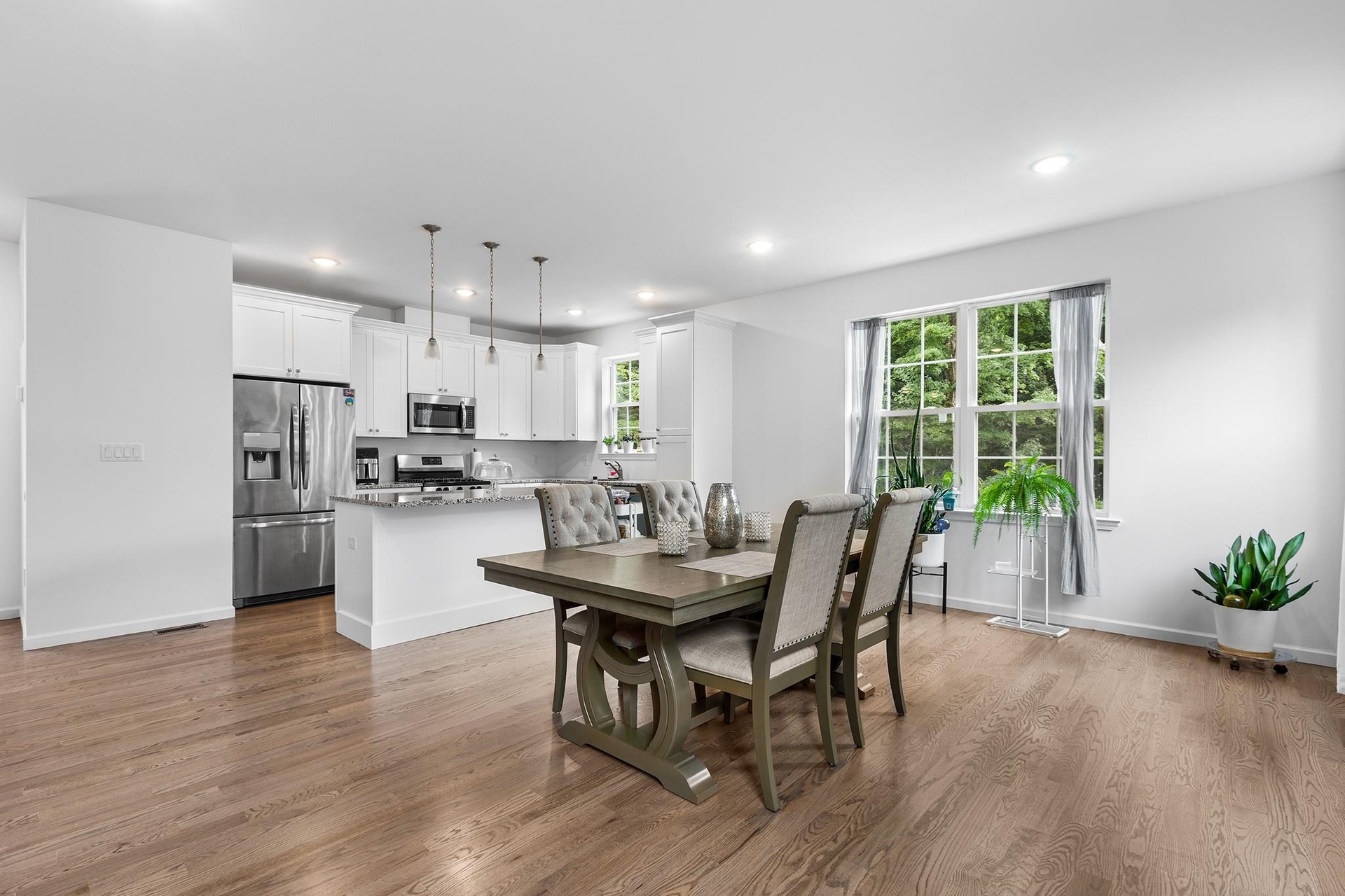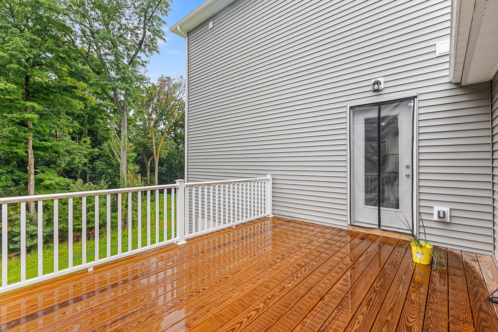 Welcome to this beautiful newly built 4-bedroom, 3.5-bath home featuring a spacious 2,760 sqft layout across three levels of living space. The gourmet kitchen features an island with a breakfast bar and flows seamlessly into a large dining area. The luxurious primary suite includes a full ensuite bath with dual vanities, a shower, and a separate soaking tub, all highlighted by expansive windows. For added convenience, the laundry room is situated upstairs near the bedrooms. The lower level offers a sliding door to a large patio, while the kitchen opens to a sizable deck on the side of the home. This property combines modern updates with ample indoor and outdoor living spaces.