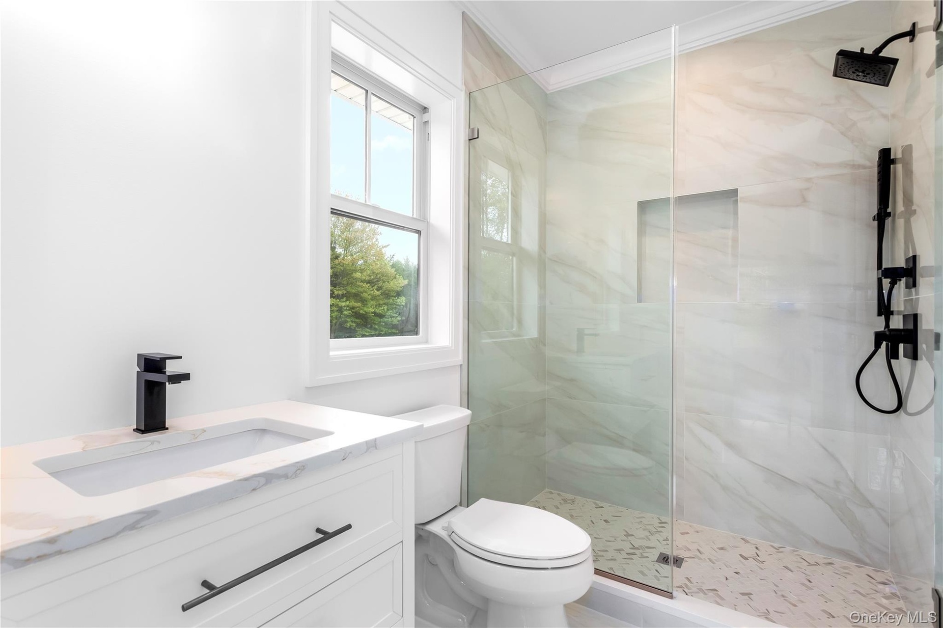 - Bathroom with healthy amount of natural light, a marble finish shower, toilet, crown molding, and vanity