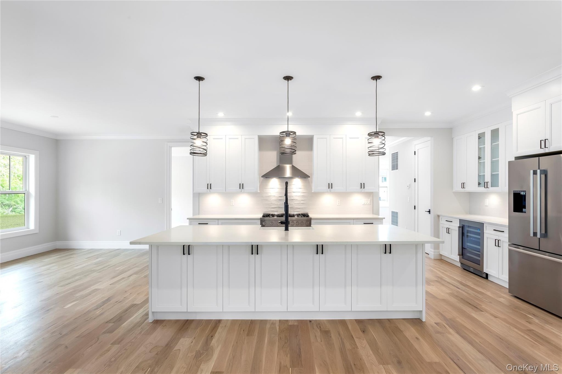 - Kitchen featuring stainless steel fridge with ice dispenser, beverage cooler, light countertops, light wood finished floors, and ornamental molding