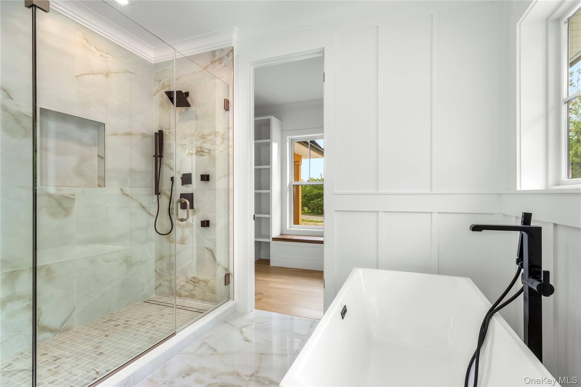- Full bathroom with marble finish flooring, crown molding, a soaking tub, a stall shower, and a decorative wall