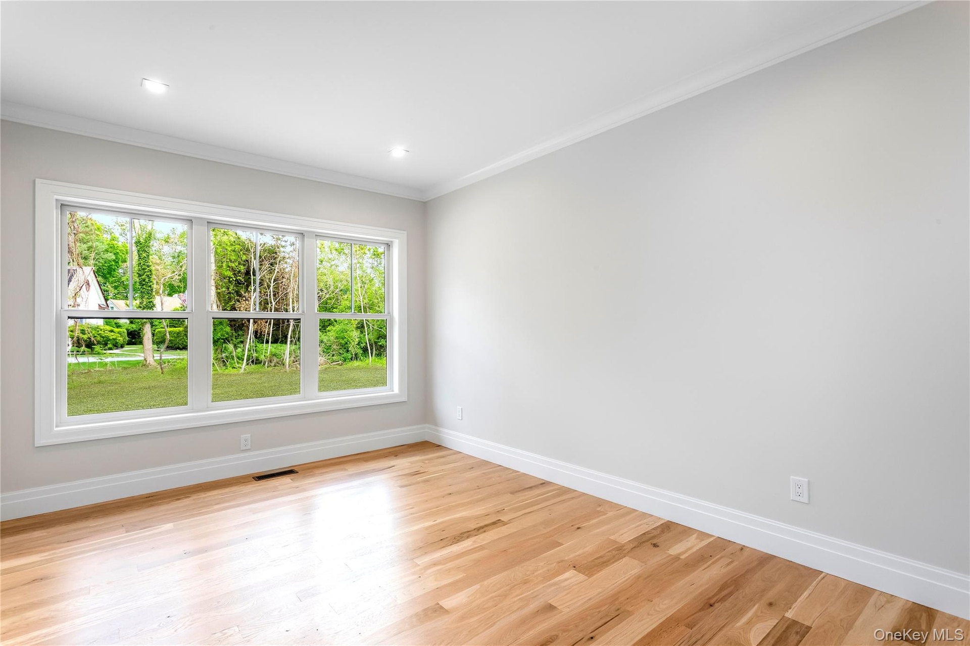 - Spare room with crown molding, baseboards, light wood finished floors, and recessed lighting