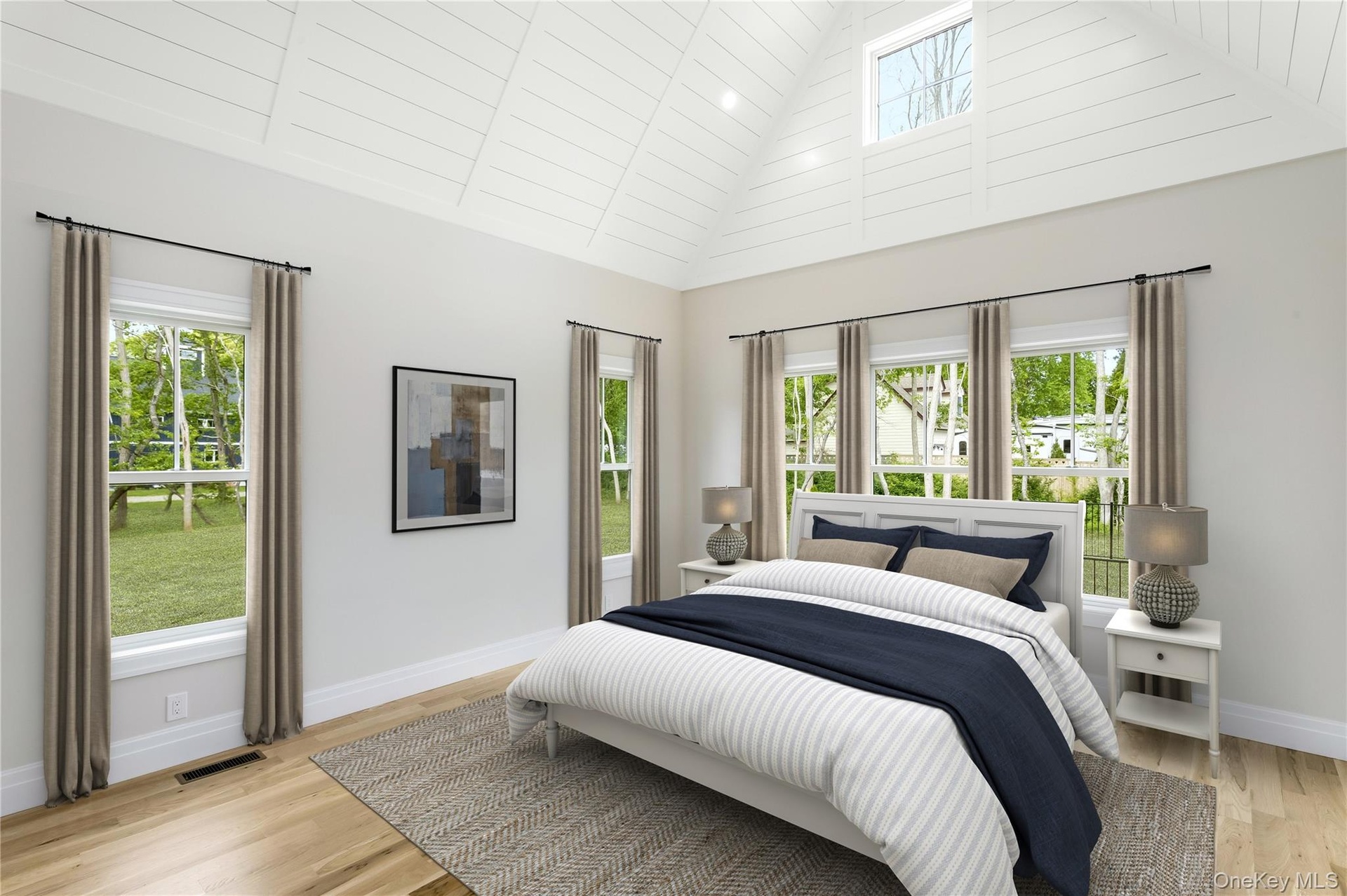 - Primary Bedroom Staged featuring high vaulted ceiling, multiple windows, and light wood finished floors