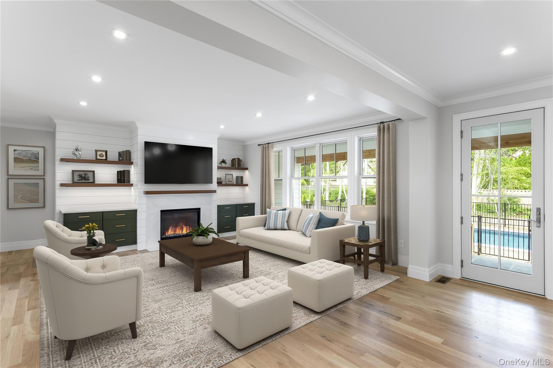 - Great Rm Open Staged Concept living with a large fireplace, crown molding, light wood-type flooring, and recessed lighting