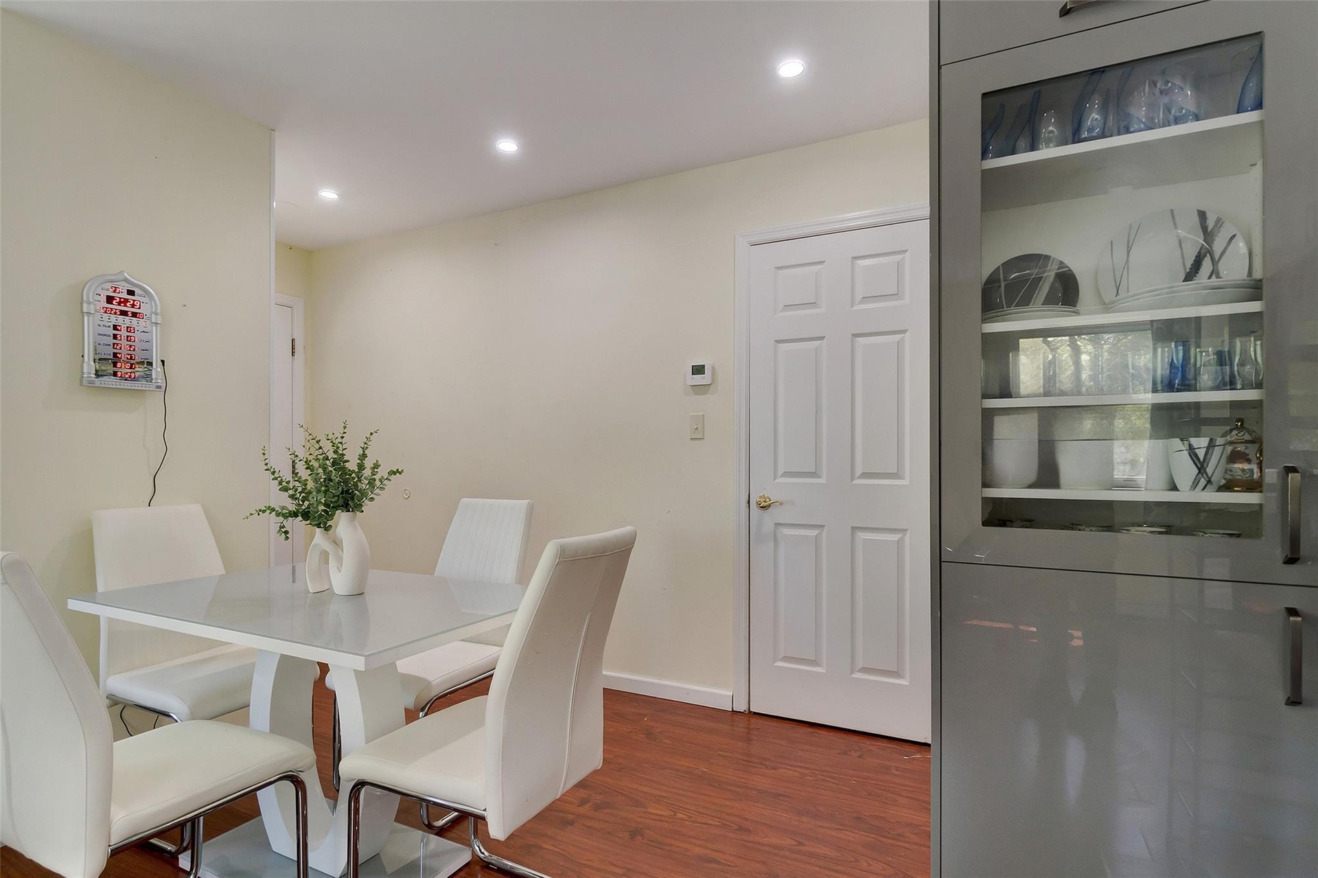 - Dining area with dark wood-type flooring, recessed lighting, and baseboards