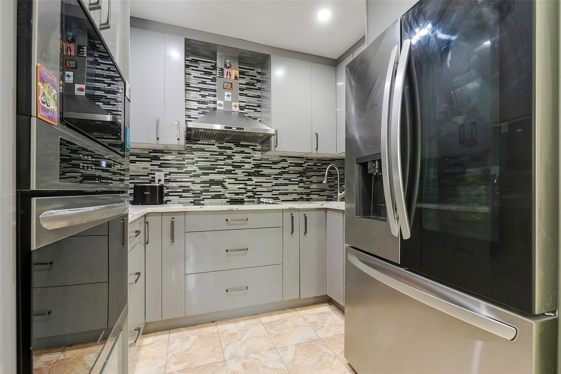 - Kitchen featuring stainless steel fridge, estacked washer and dryer, gray cabinetry, tasteful backsplash, and recessed lighting