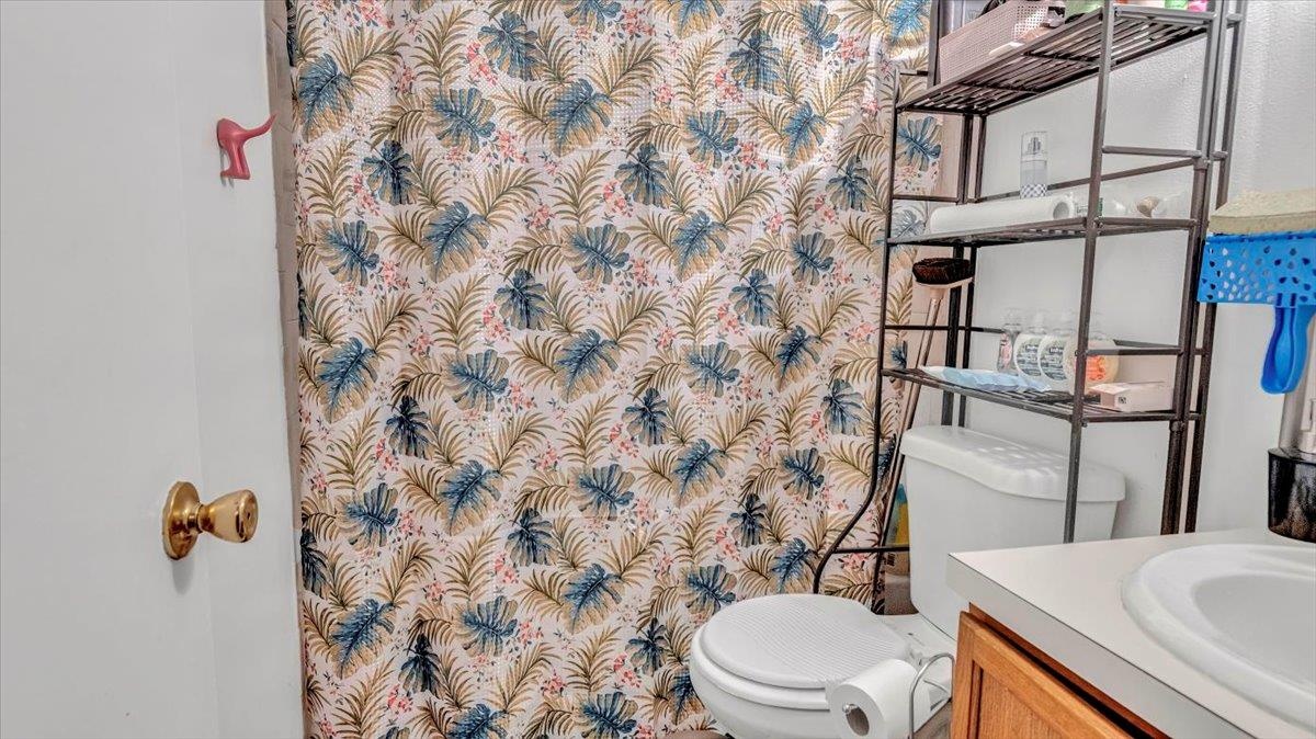 - Full bath featuring toilet, vanity, and a shower with shower curtain