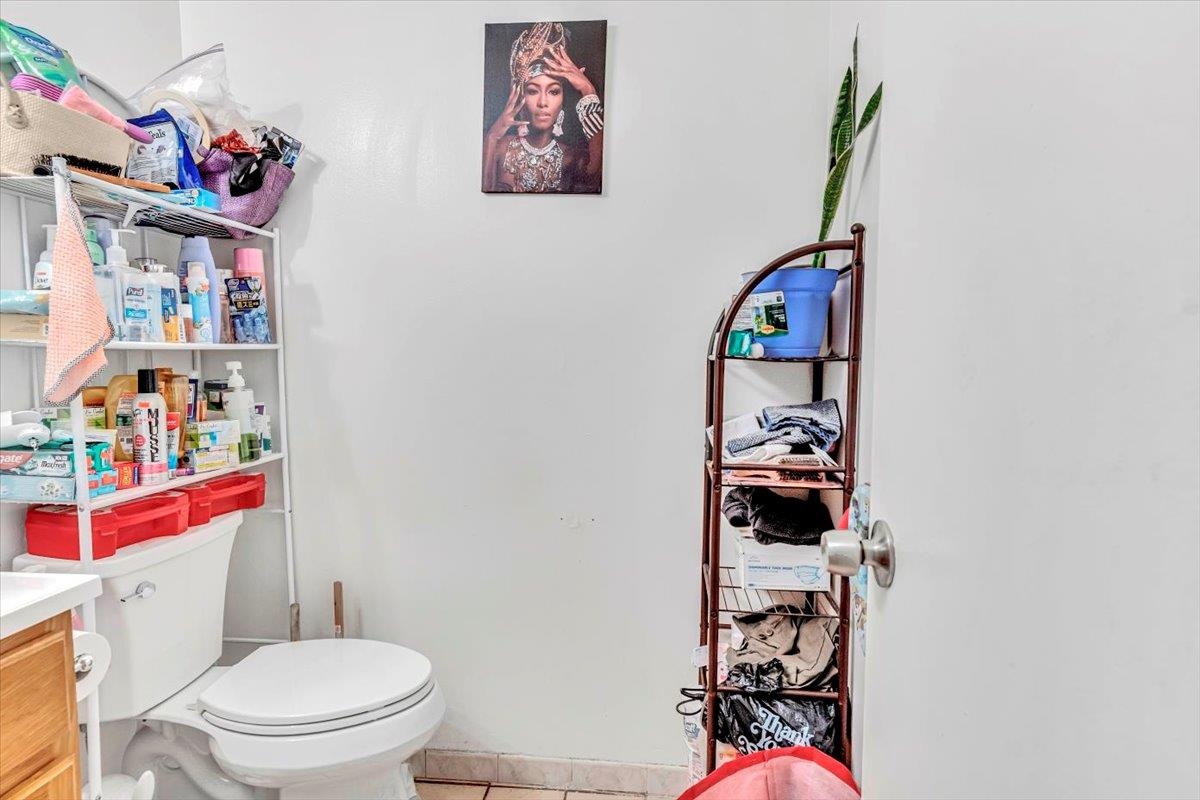 - Half bathroom with toilet, tile patterned flooring, and vanity