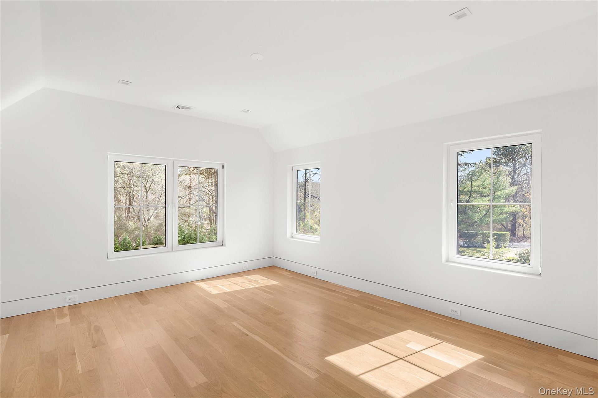 - Spare room featuring light wood-style floors, visible vents, and vaulted ceiling