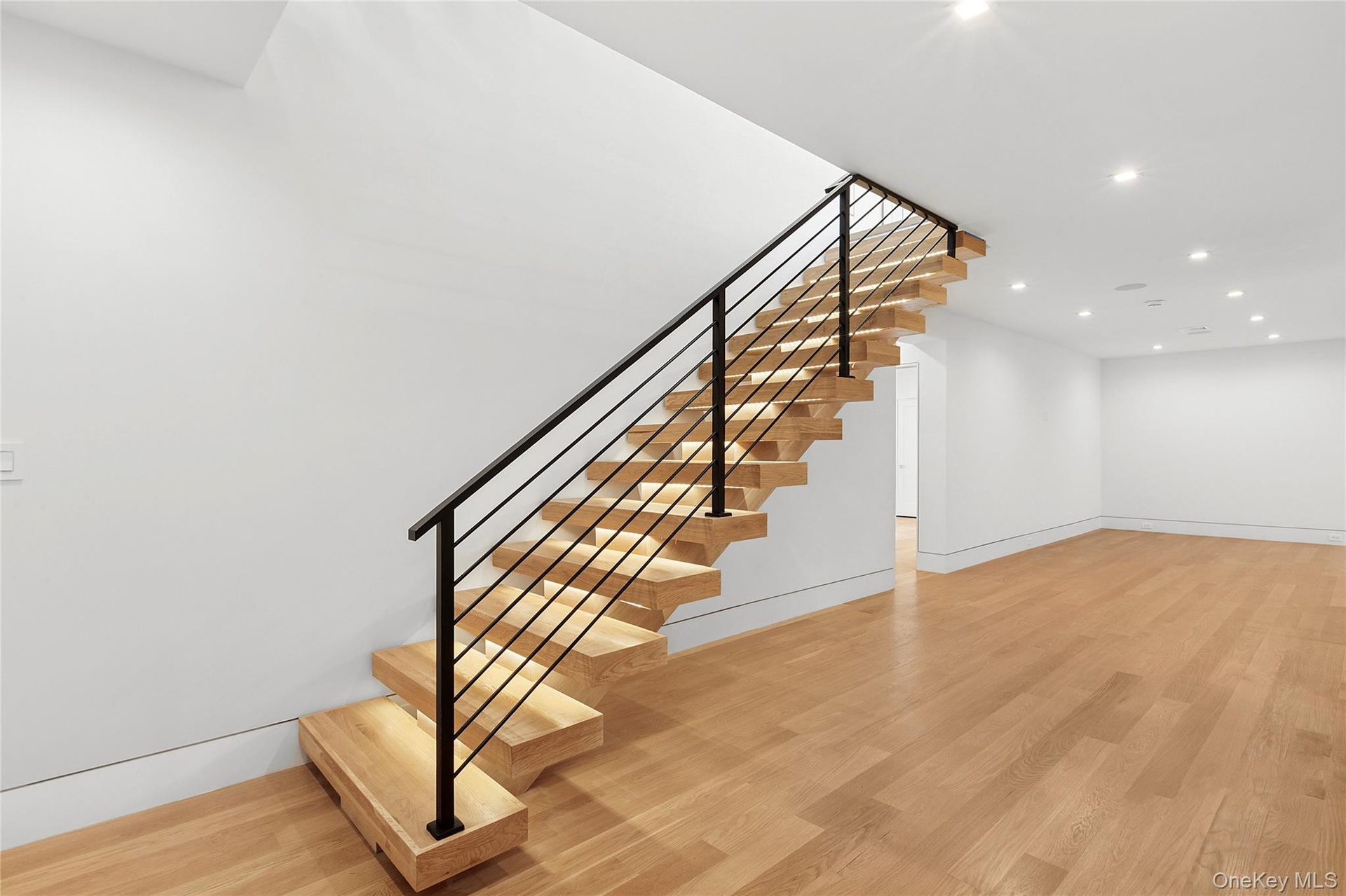 - Staircase with baseboards, recessed lighting, and wood finished floors