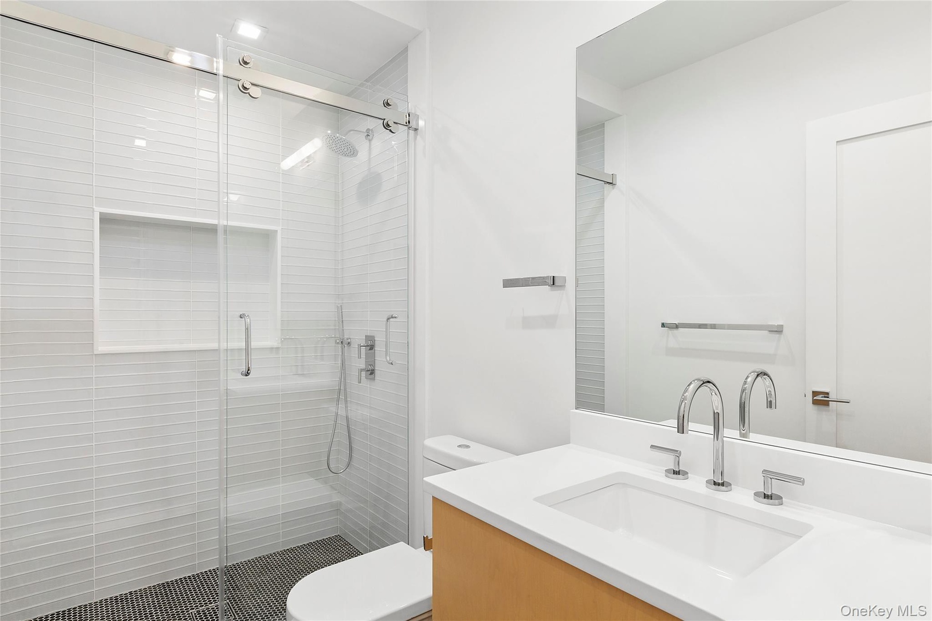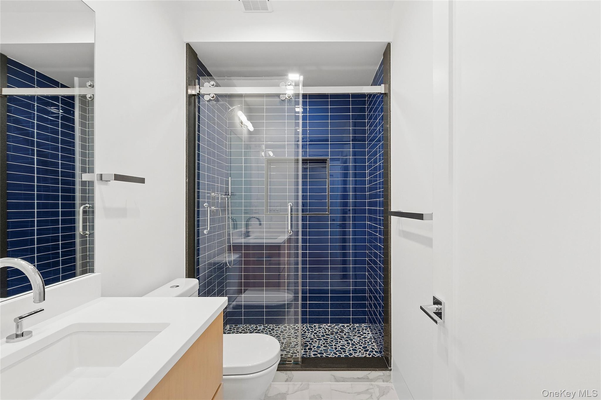 - Bathroom featuring toilet, marble finish floor, vanity, visible vents, and a shower stall