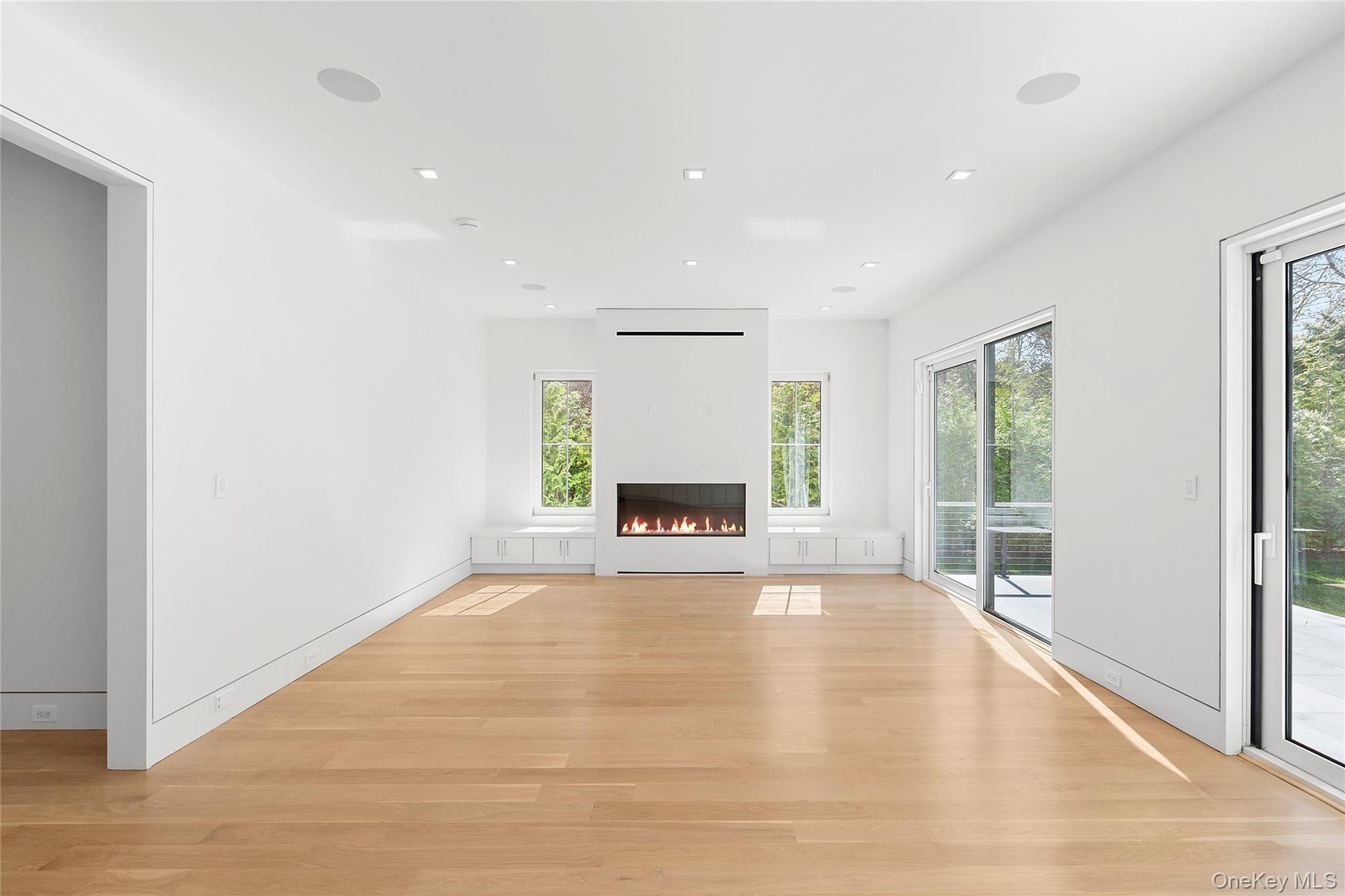 - Unfurnished living room with recessed lighting, a glass covered fireplace, and light wood-style floors