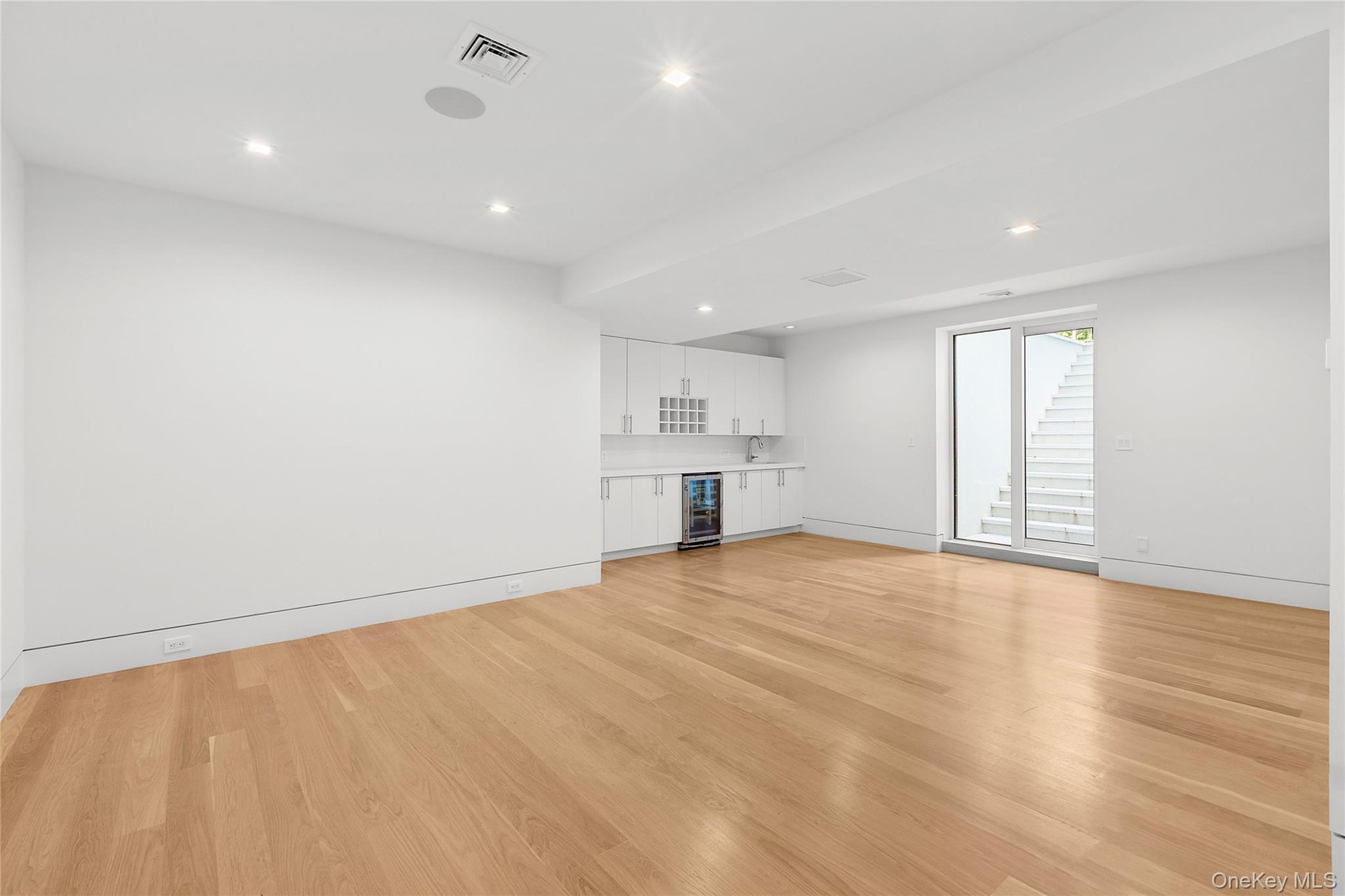 - Unfurnished living room featuring light wood finished floors, a bar, recessed lighting, and wine cooler