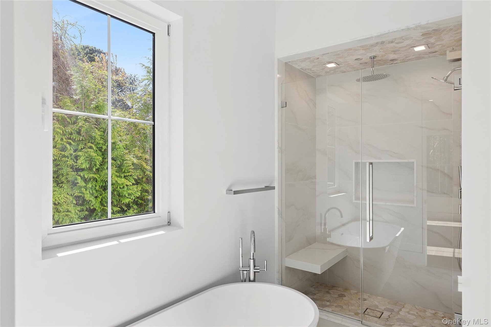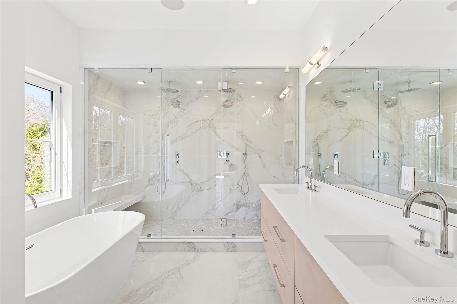 - Full bathroom featuring a marble finish shower, plenty of natural light, and a sink