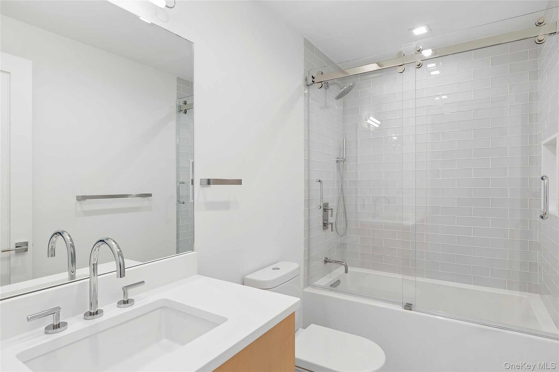 - Bathroom featuring toilet, vanity, and shower / bath combination with glass door