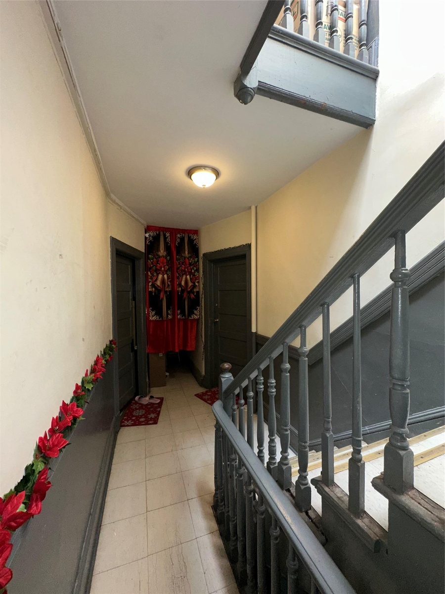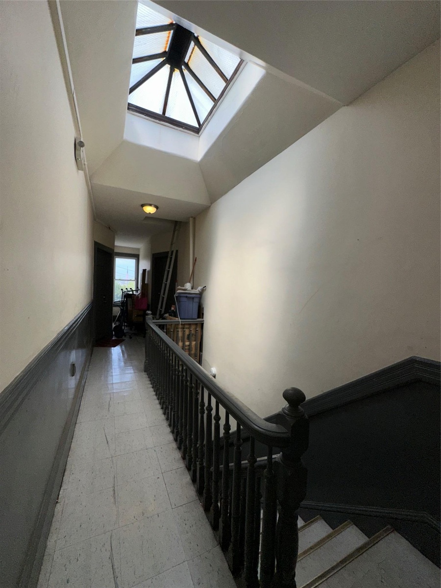 - Staircase featuring lofted ceiling with skylight and tile patterned floors