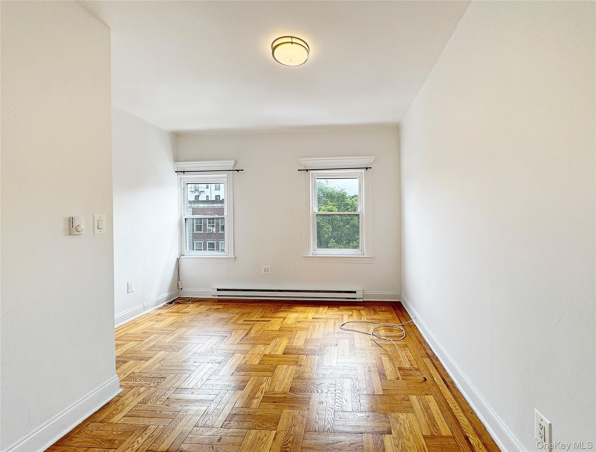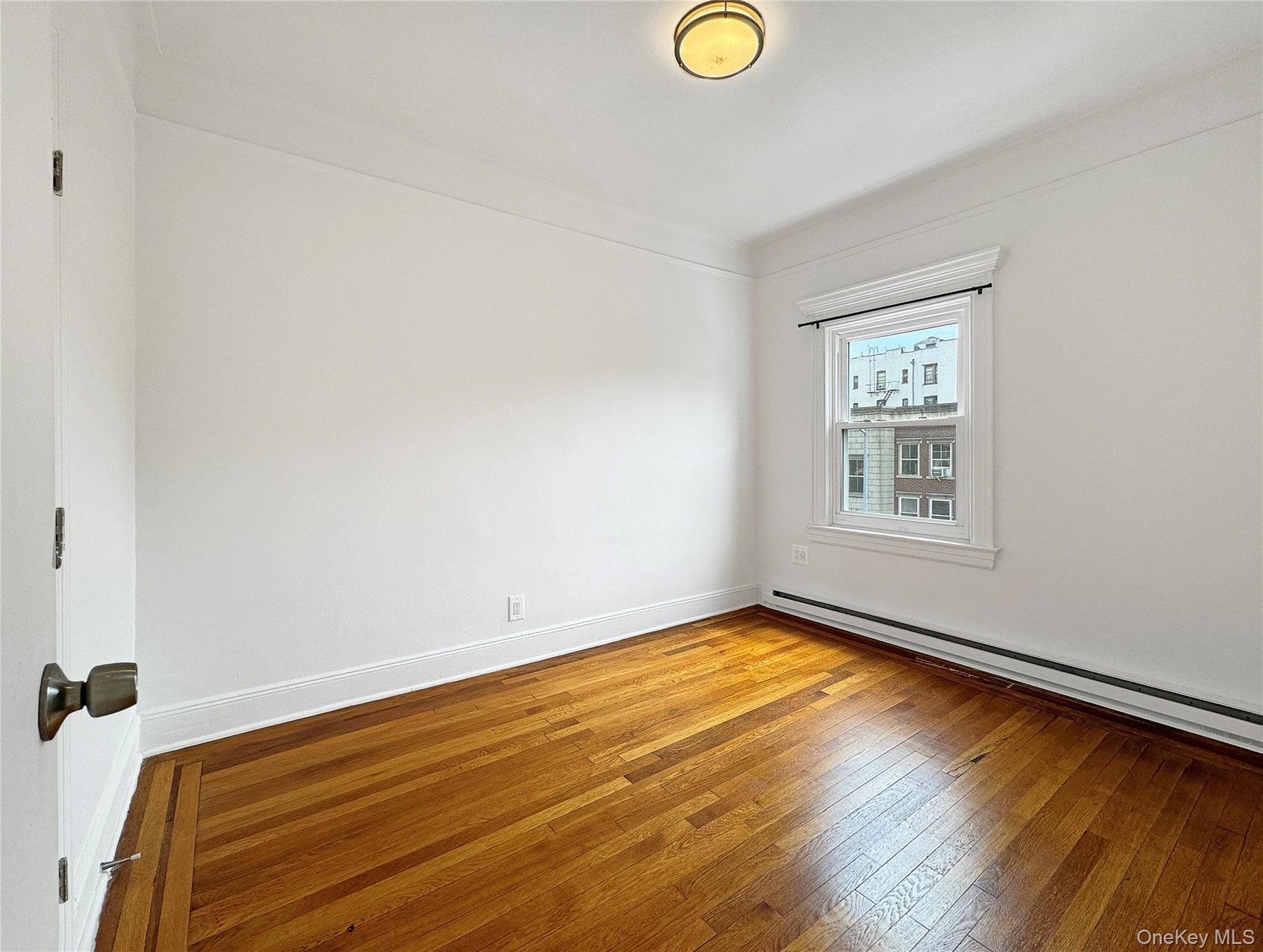 - Unfurnished room with baseboard heating and hardwood / wood-style flooring