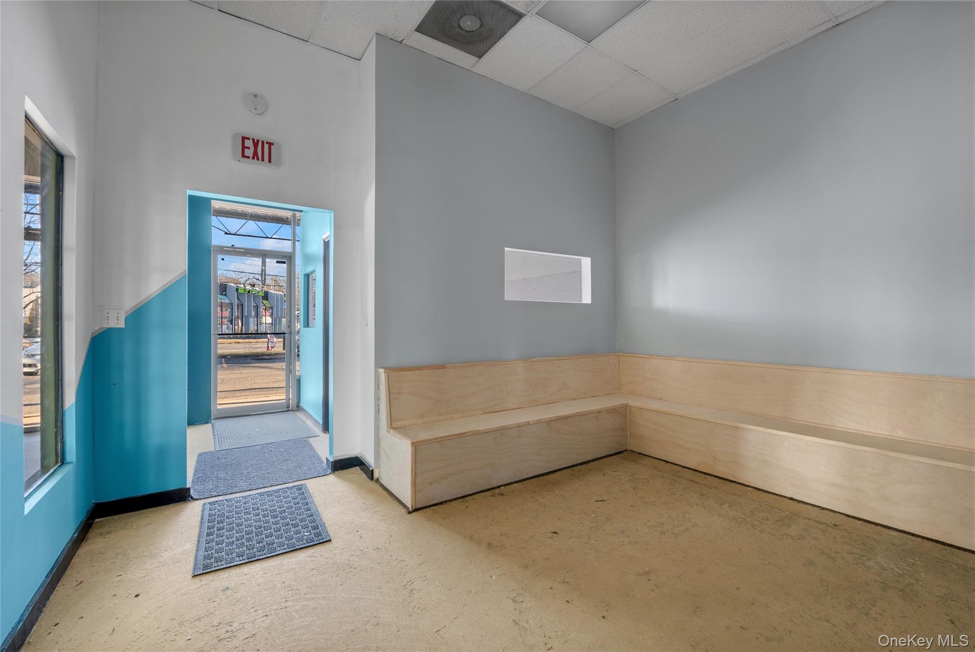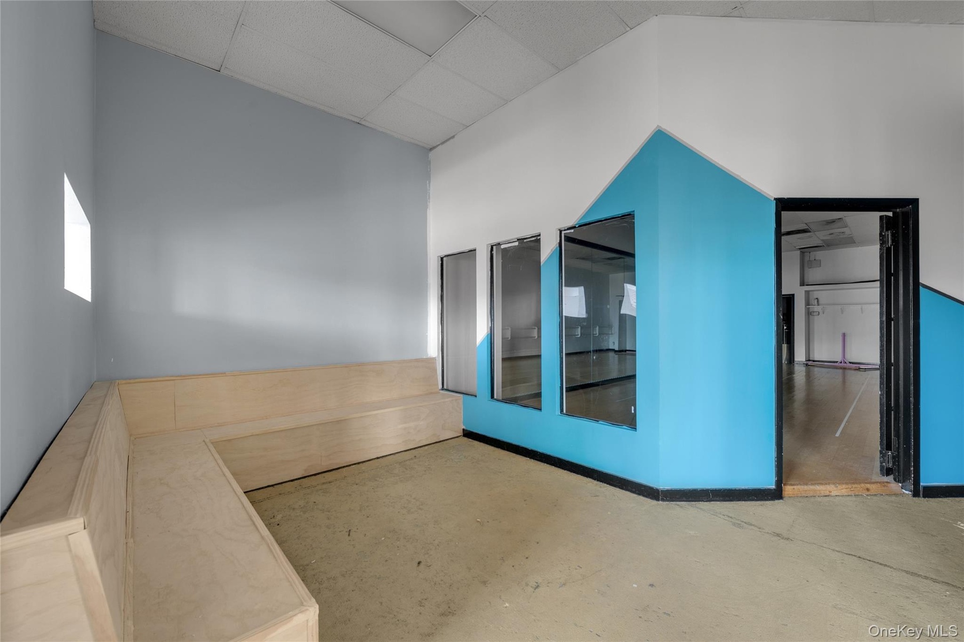 - Empty room featuring unfinished concrete flooring, a paneled ceiling, and a high ceiling
