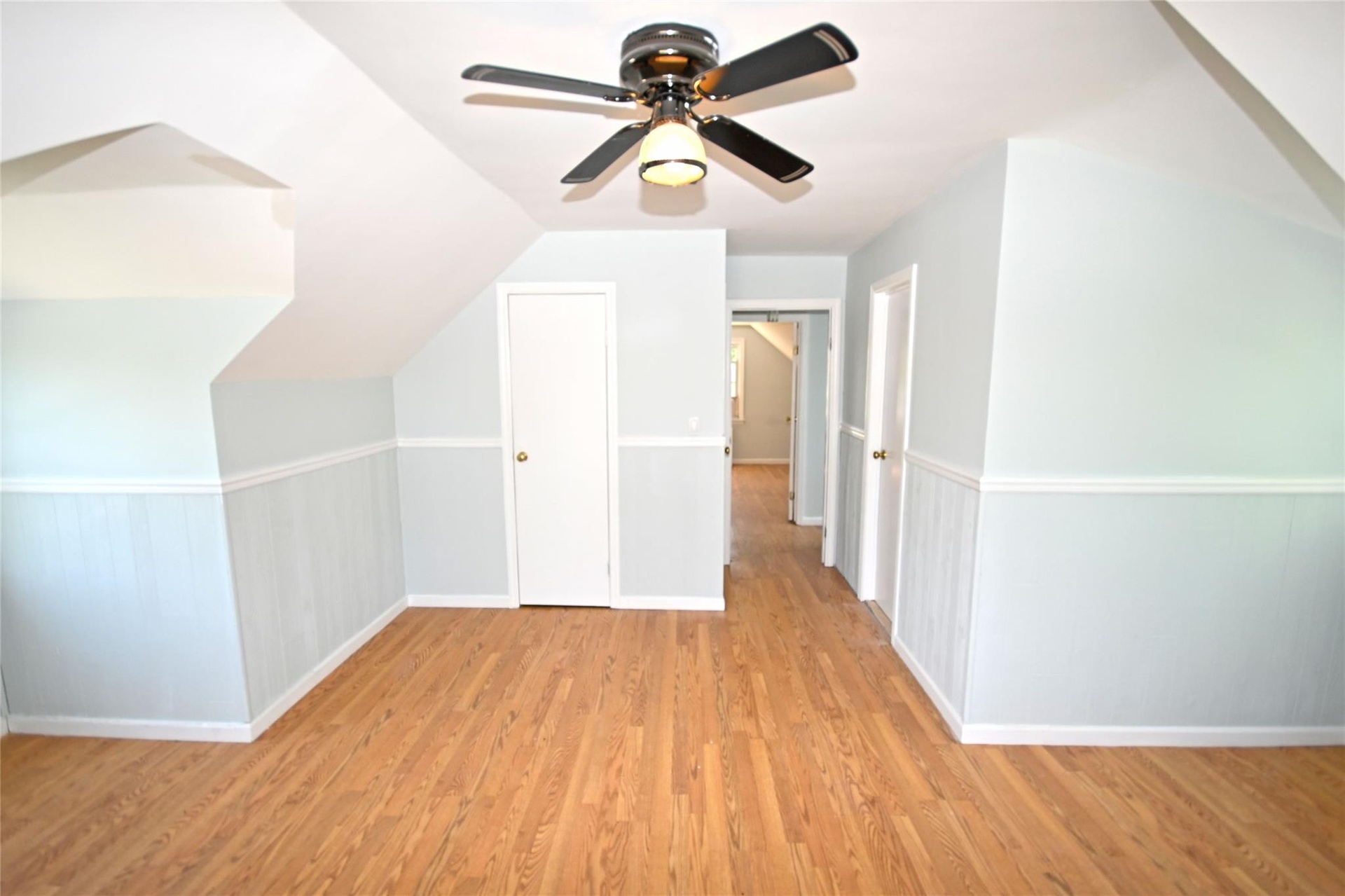 - Additional living space with light wood-style flooring, a ceiling fan, baseboards, and lofted ceiling