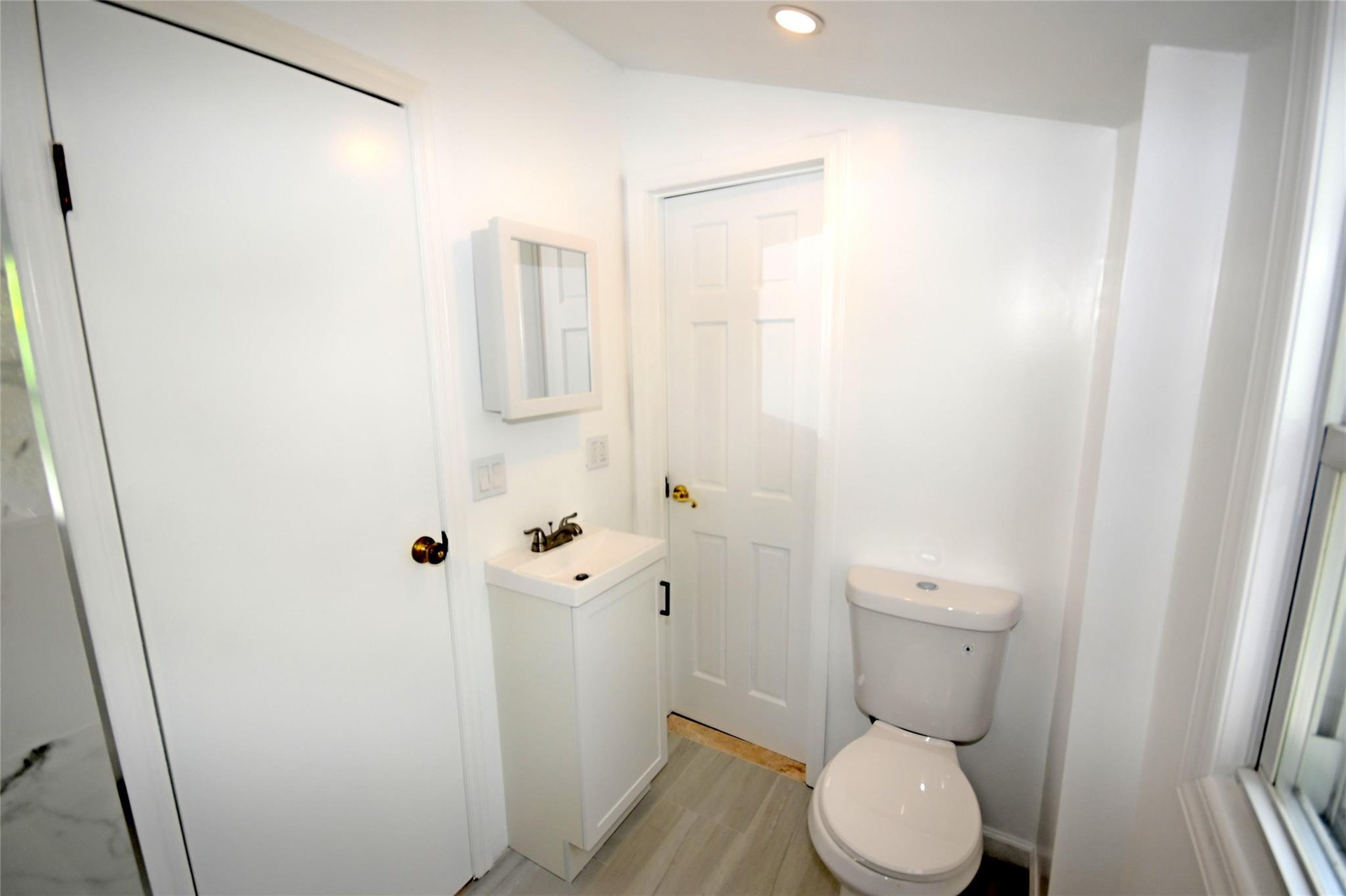 - Bathroom featuring toilet, vanity, recessed lighting, and wood finished floors