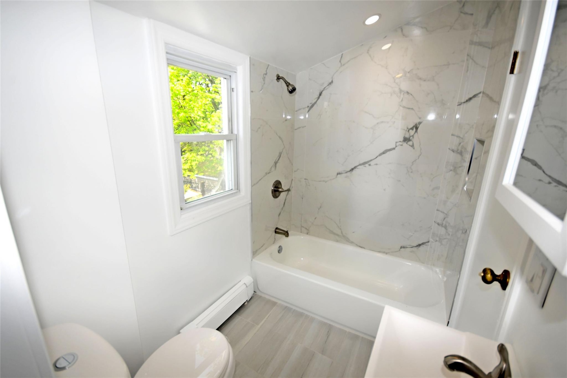 - Bathroom featuring baseboard heating, toilet, shower / tub combination, and recessed lighting