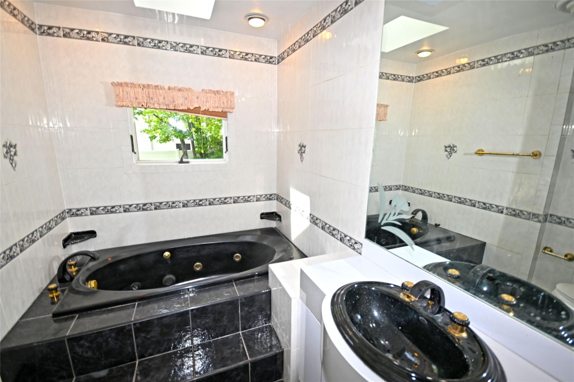 - Bathroom with tile walls, a whirlpool tub, and vanity