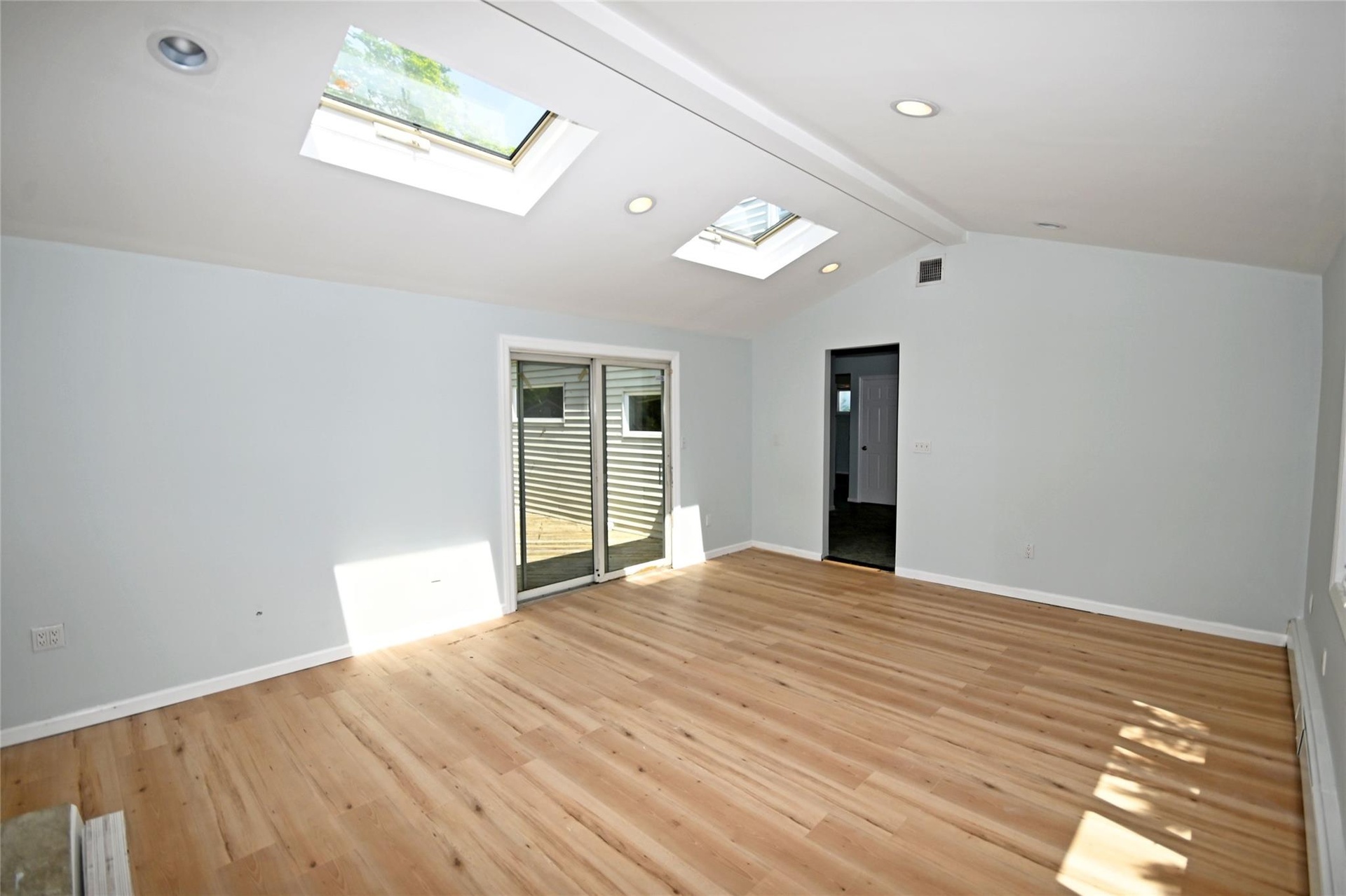 - Empty room featuring a skylight, light wood-style floors, baseboards, and recessed lighting