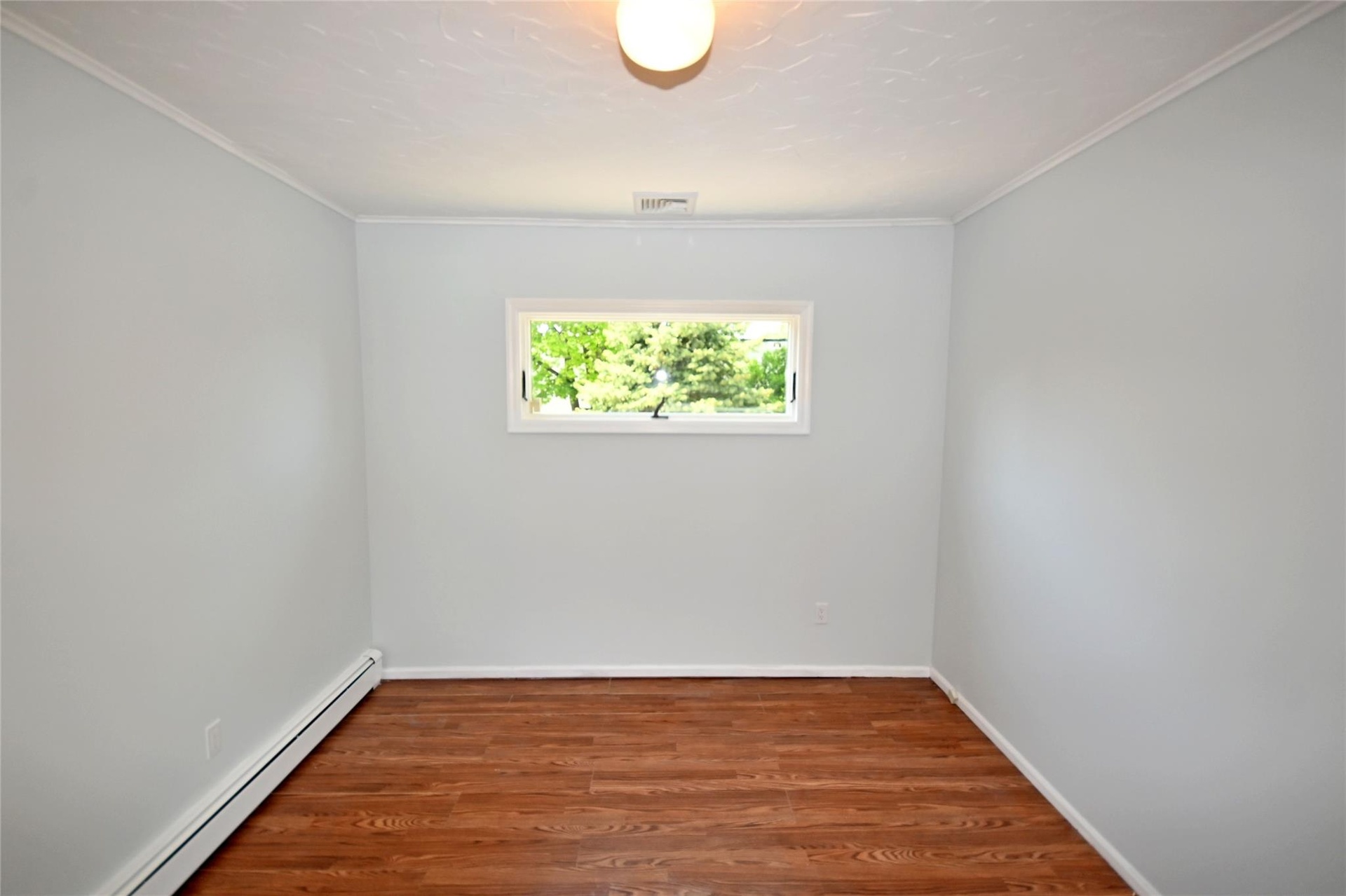 - Spare room with a baseboard heating unit, wood finished floors, baseboards, and crown molding