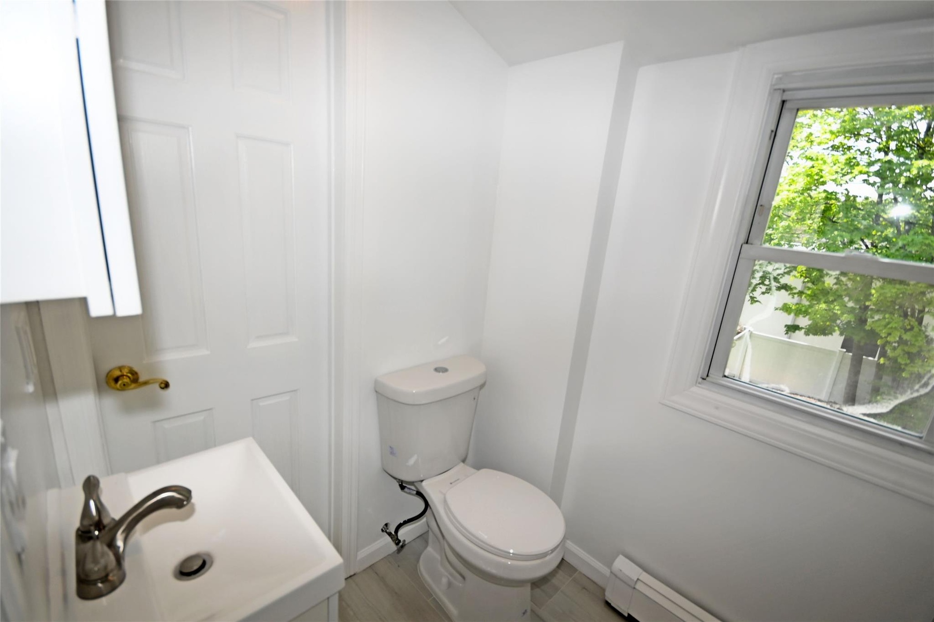 - Bathroom featuring a baseboard heating unit, toilet, plenty of natural light, and wood finished floors