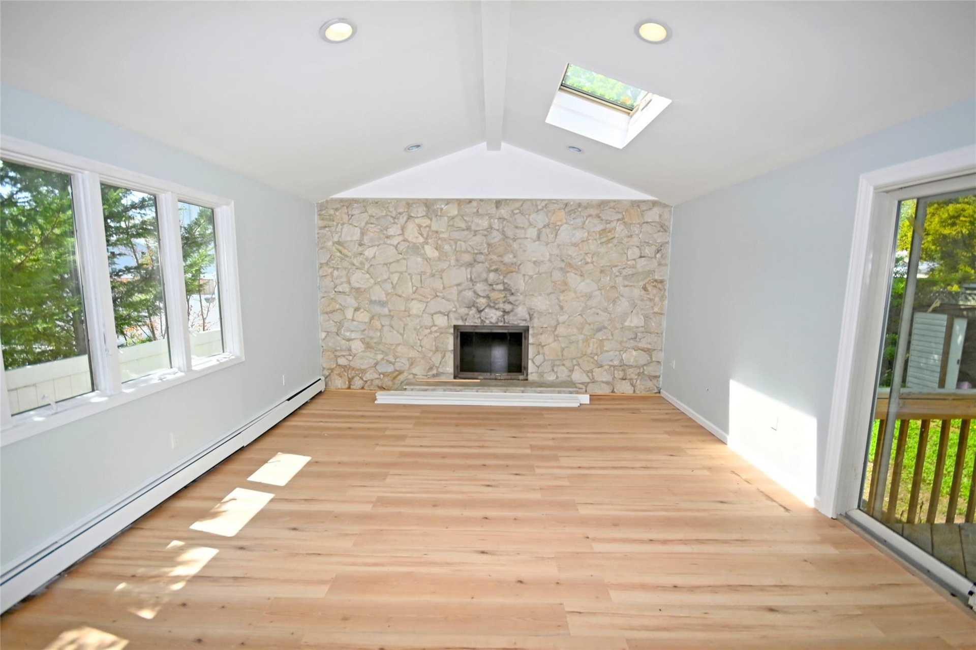 - Unfurnished living room with a baseboard radiator, a skylight, a fireplace, and light wood finished floors