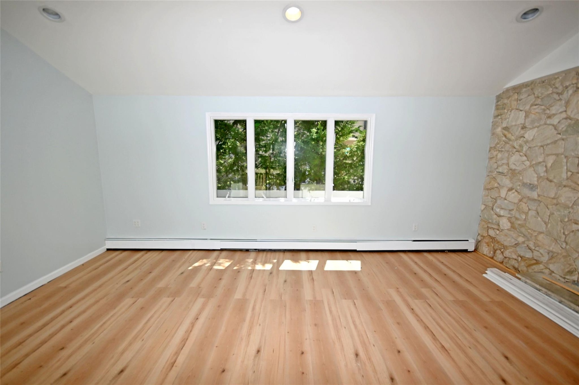 - Additional living space with radiator heating unit, light wood finished floors, lofted ceiling, cooling unit, and baseboards