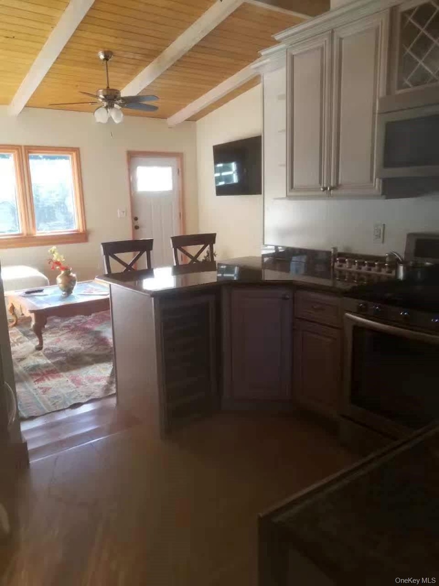 - Kitchen featuring stainless steel appliances, wooden ceiling with exposed beams, dark countertops, a peninsula, and a sink