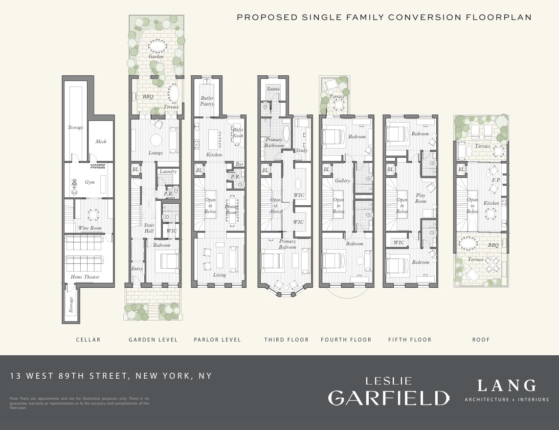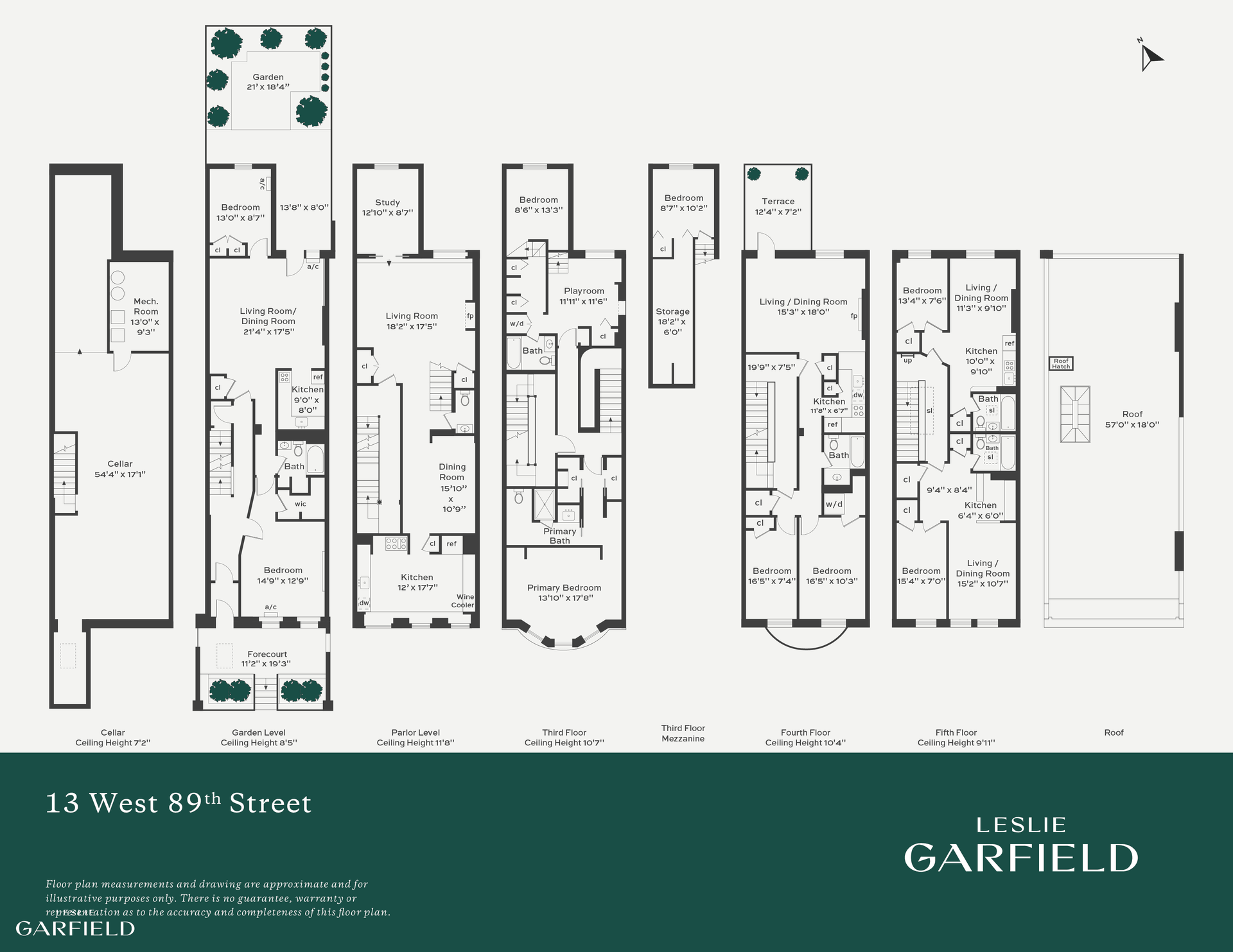 Welcome to 13 West 89th Street, a classic brownstone built in 1894 by architects Neville & Bagge in the Renaissance Revival style. Offering the potential for single-family conversion, an appealing live-with-income or investment opportunity, this property is located just two brownstones west of Central Park West. The 19.5-foot wide, 5-unit home spans approximately 6,395 square feet and is currently configured to maximize both luxurious living and rental income. The owners duplex, comprising the 2nd and 3rd levels, features 118 ceiling heights on the parlor level, creating an airy and grand atmosphere. Designed in a clean and modern style, the parlor level features a formal living and dining space, an office, and an eat-in kitchen. The office benefits from exceptional natural light and a thoughtful layout, making it an ideal space for working from home. A standout design element is the wrap-around staircase with a floating stair, seamlessly blending form and function while adding a touch of architectural elegance. The third floor features a flexible rear wing that can serve as a playroom, office, or additional living area, two bedrooms, and a washer and dryer for added convenience. The primary suite offers comfort and privacy, highlighted by a gorgeous and original wood-frame bay window that brings in incredible sunlight. The 4th floor features a 2-bedroom floor-through apartment with an in-unit washer-dryer and private terrace, perfect for enjoying outdoor space and sunlight. The top floor hosts two one-bedroom apartments, both ideal for rental income or accommodating guests. The garden unit is a spacious 2-bedroom residence with private garden access, providing a tranquil respite in the heart of the city. As the building will be delivered vacant, there is optionality for a single-family conversion or the opportunity to live expense-free in a live-with-income property. Located just steps from Central Park, this neighborhood includes top Manhattan schools, restaurants, shopping, and cultural institutionsoffering the best of Upper West Side living.