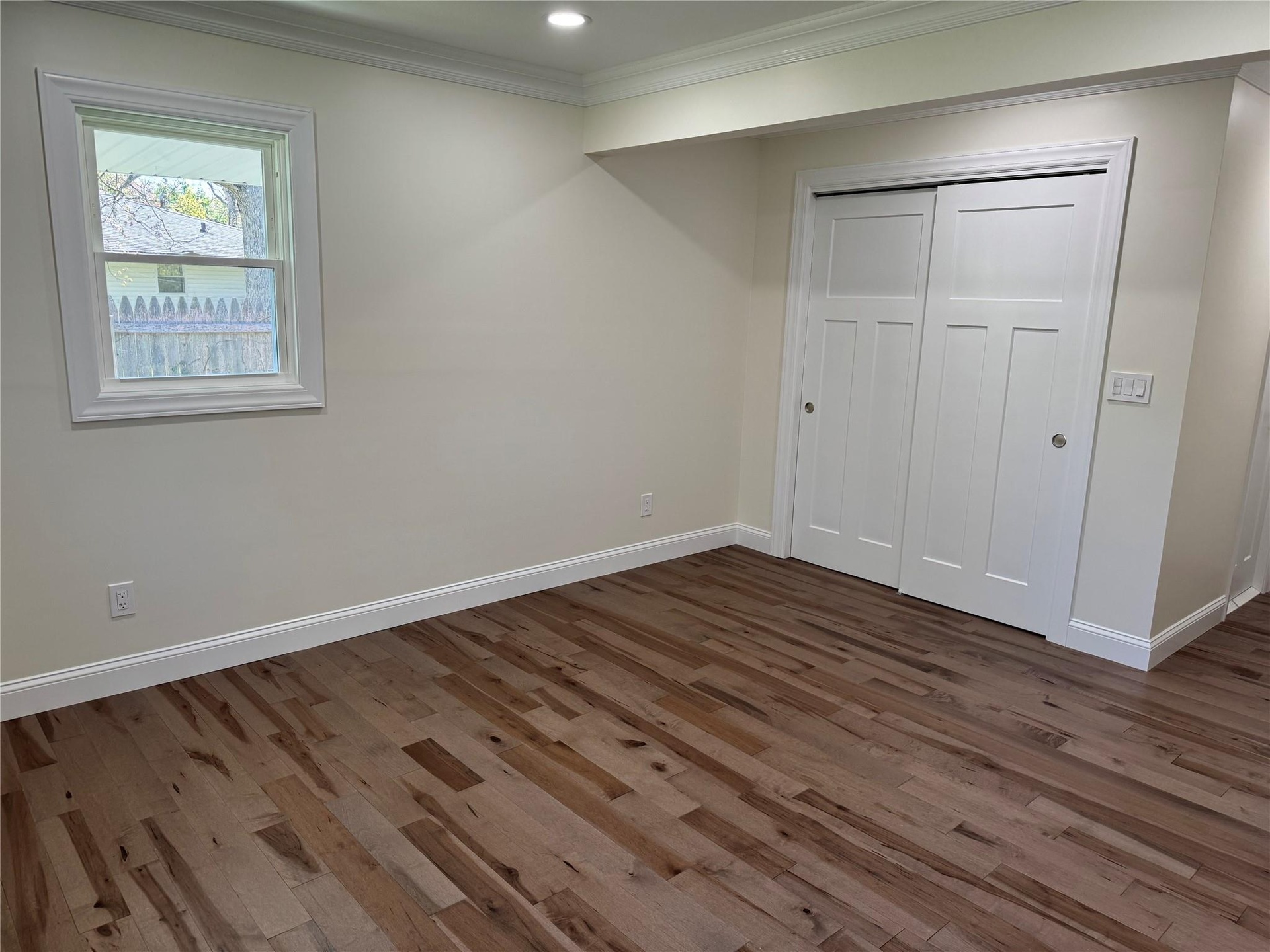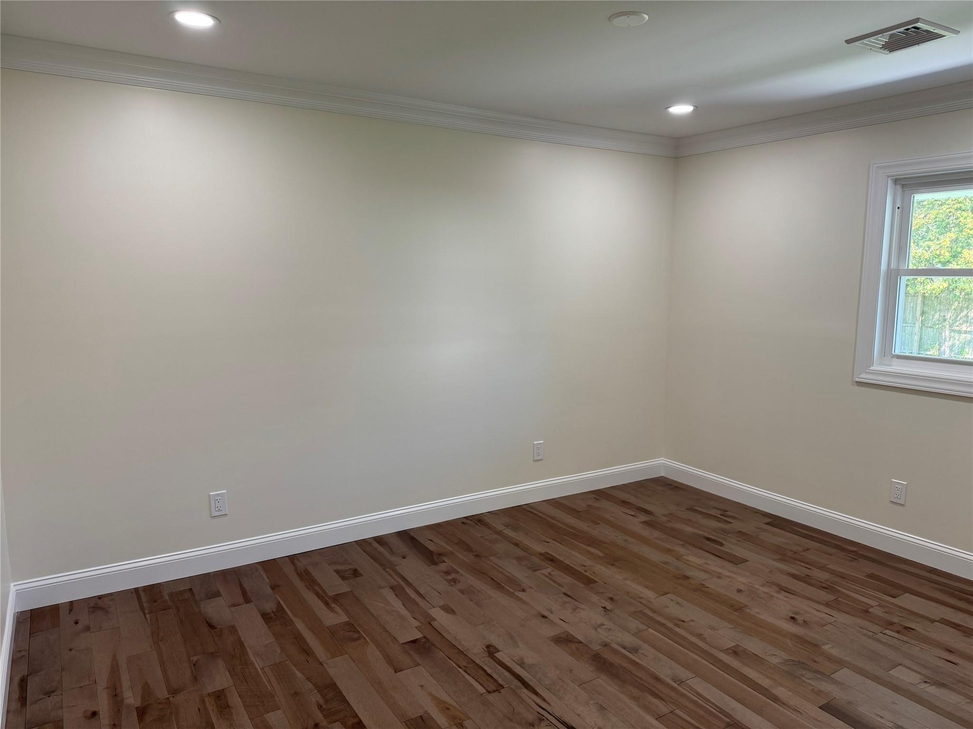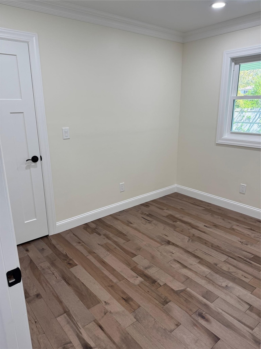 - Spare room with ornamental molding, hardwood / wood-style flooring, recessed lighting, and baseboards