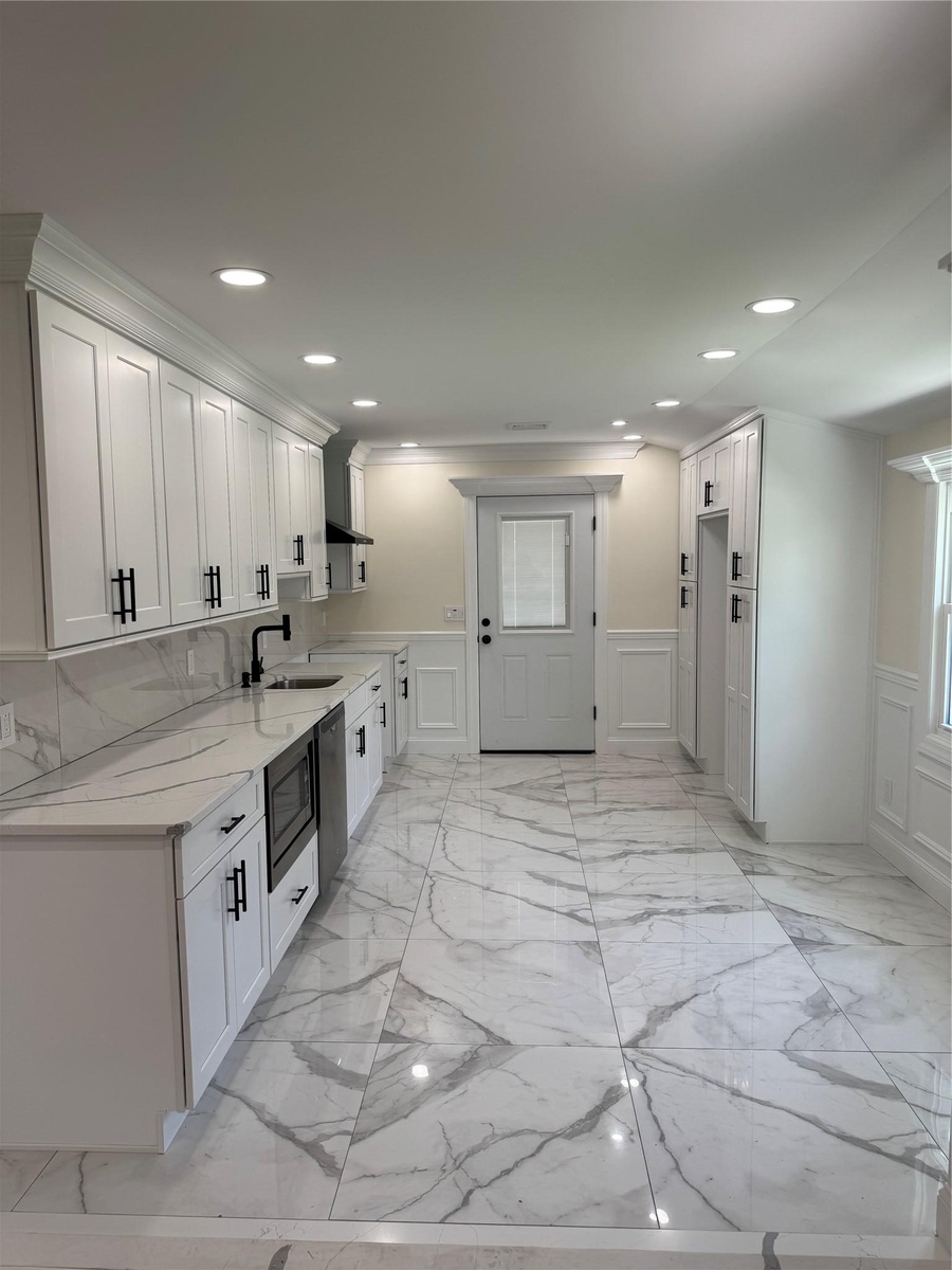 - Kitchen featuring a decorative wall, a sink, a wainscoted wall, white cabinets, and light marble finish flooring