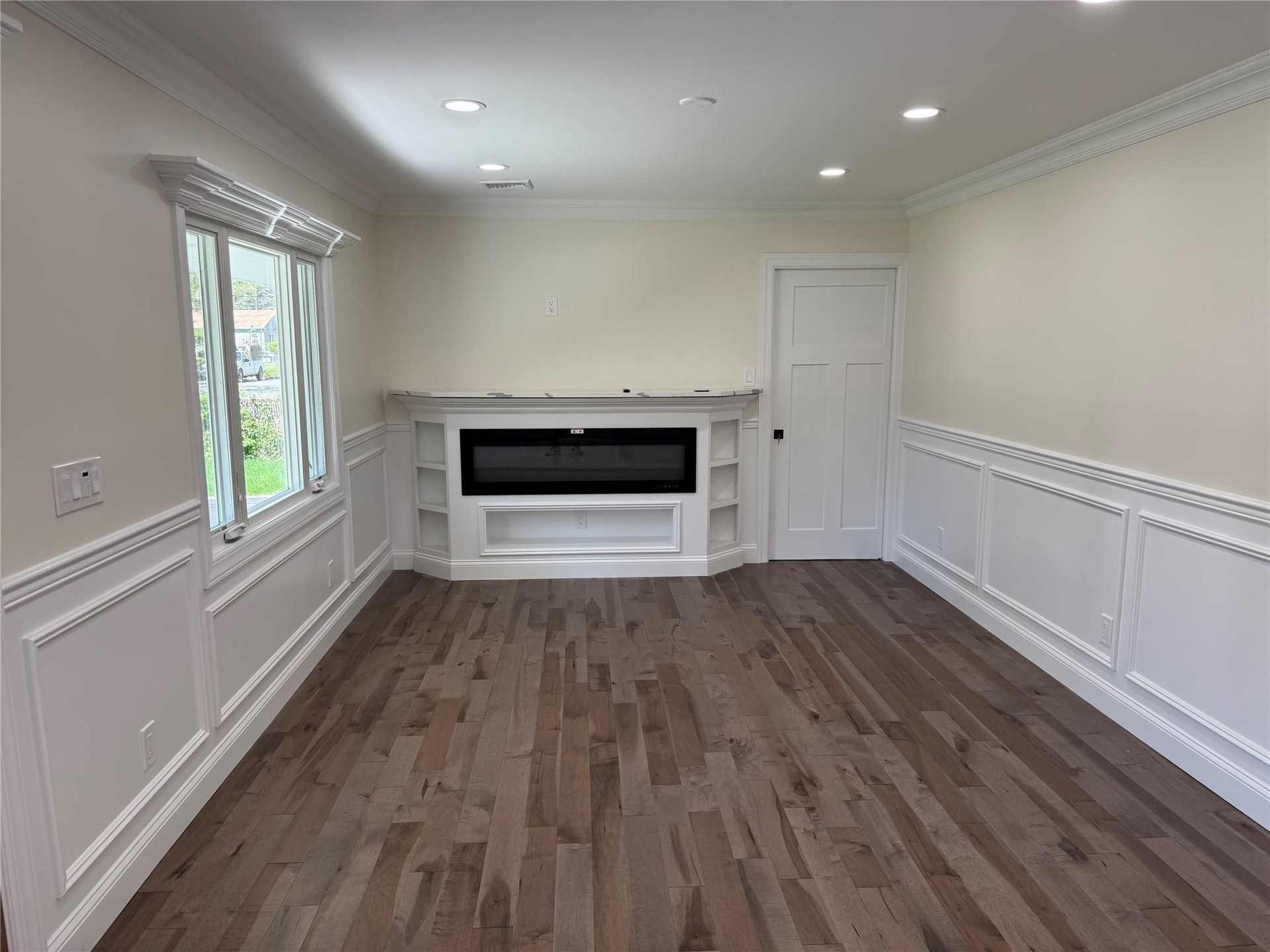- Unfurnished living room with a glass covered fireplace, a decorative wall, a wainscoted wall, dark wood finished floors, and crown molding