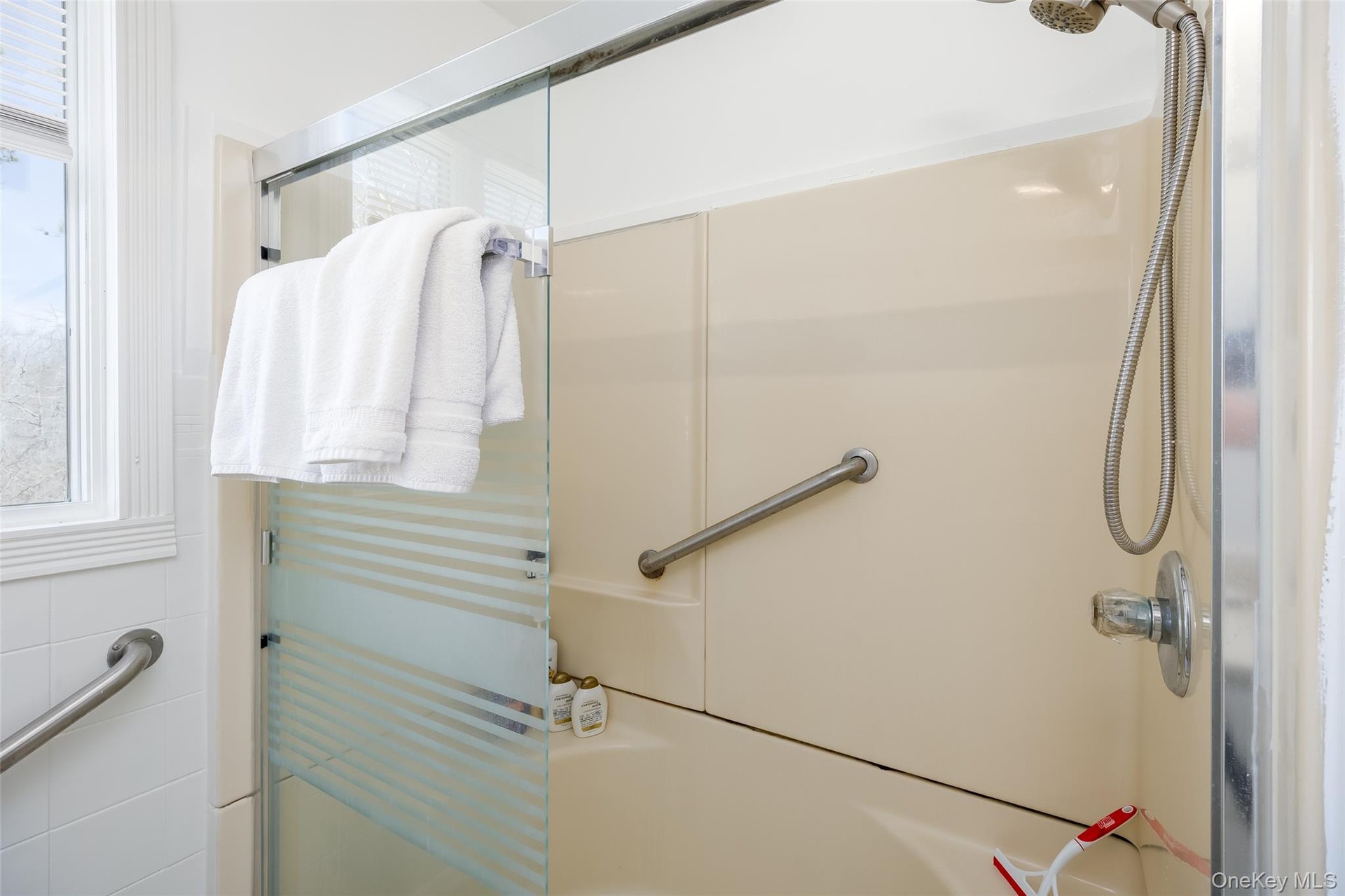 - Bathroom with a shower with shower door and healthy amount of natural light