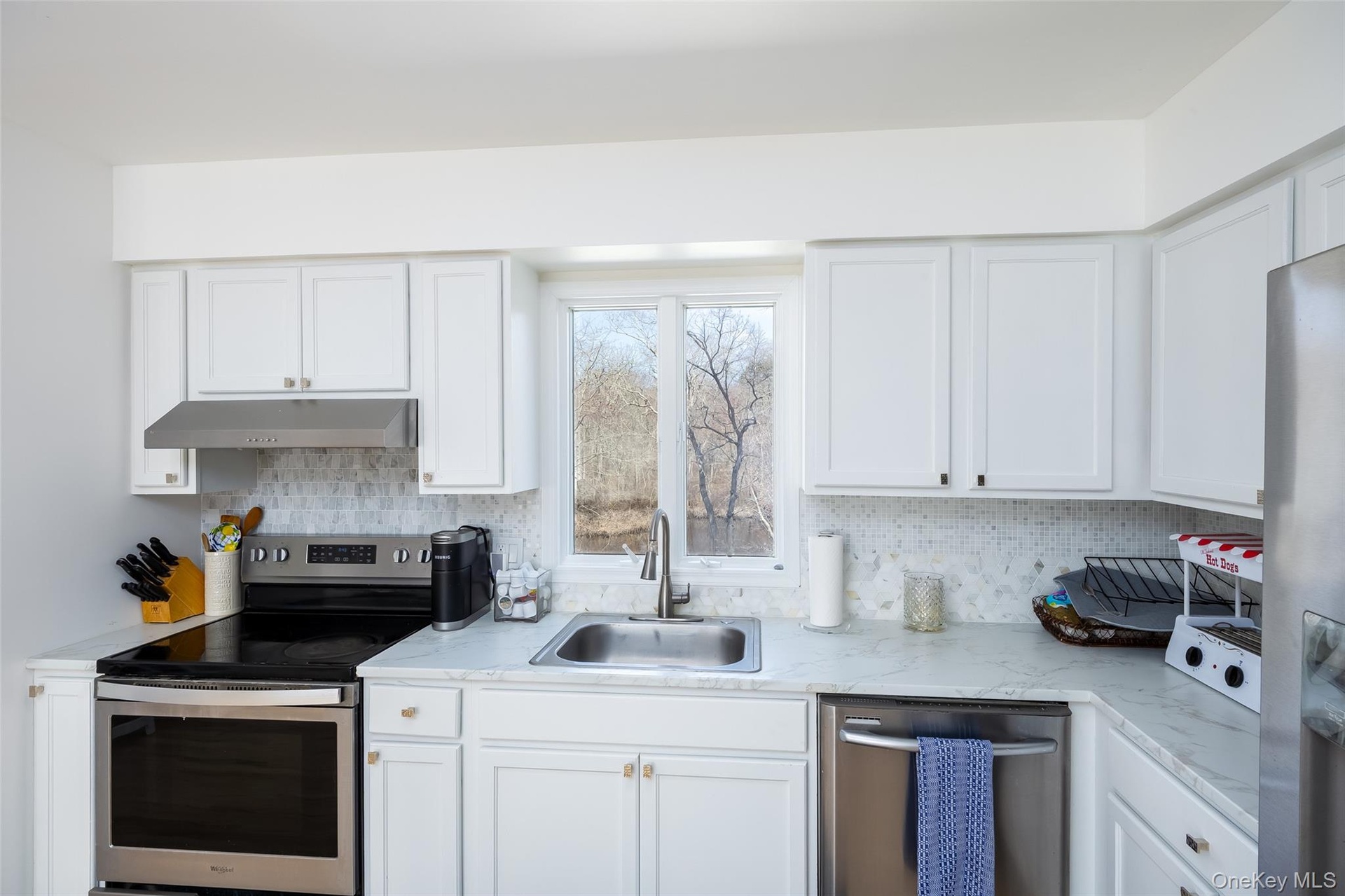 - Kitchen with stainless steel appliances, a sink, under cabinet range hood, decorative backsplash, and white cabinets