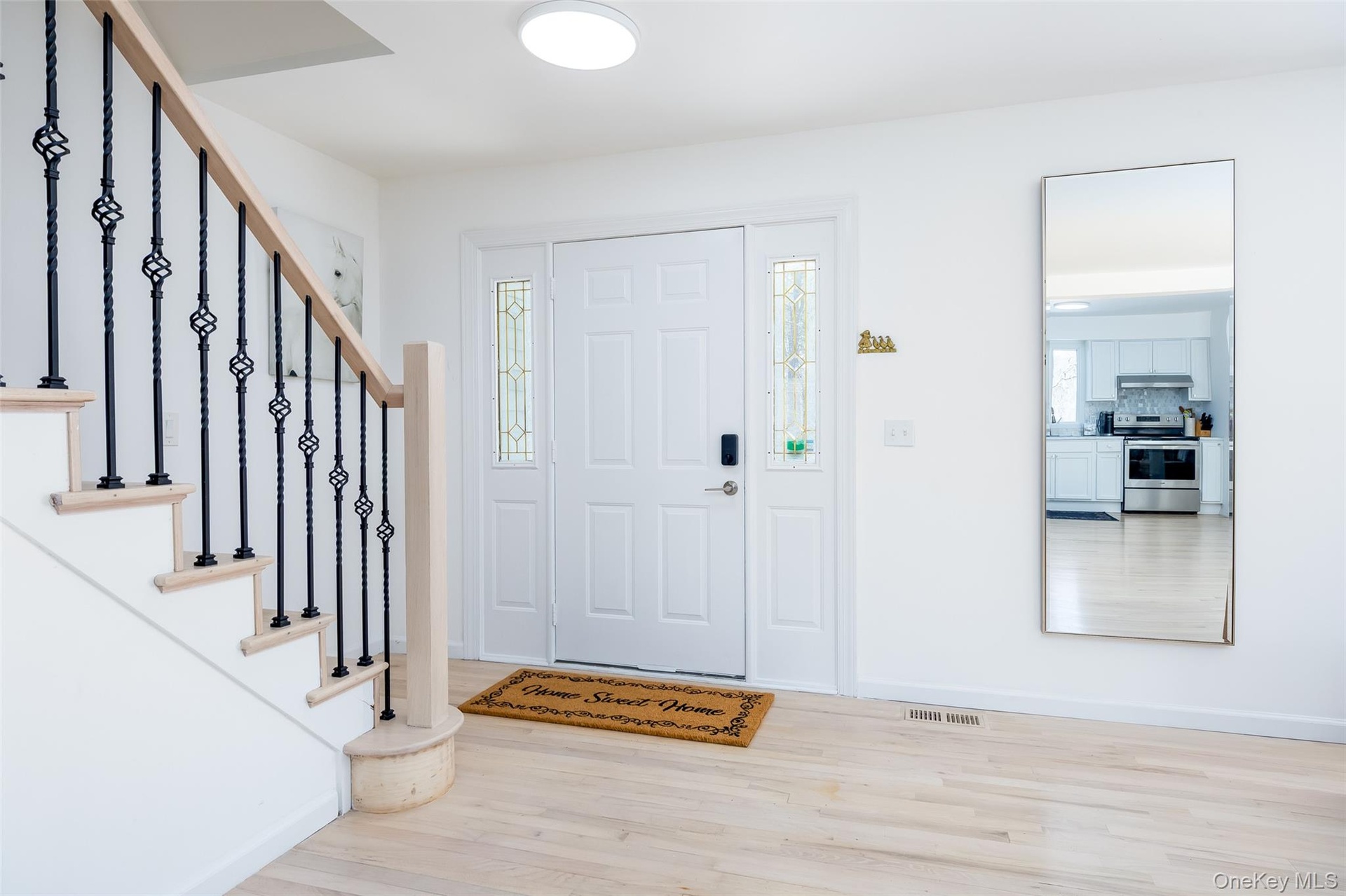- Entrance foyer featuring wood finished floors, stairs, and baseboards