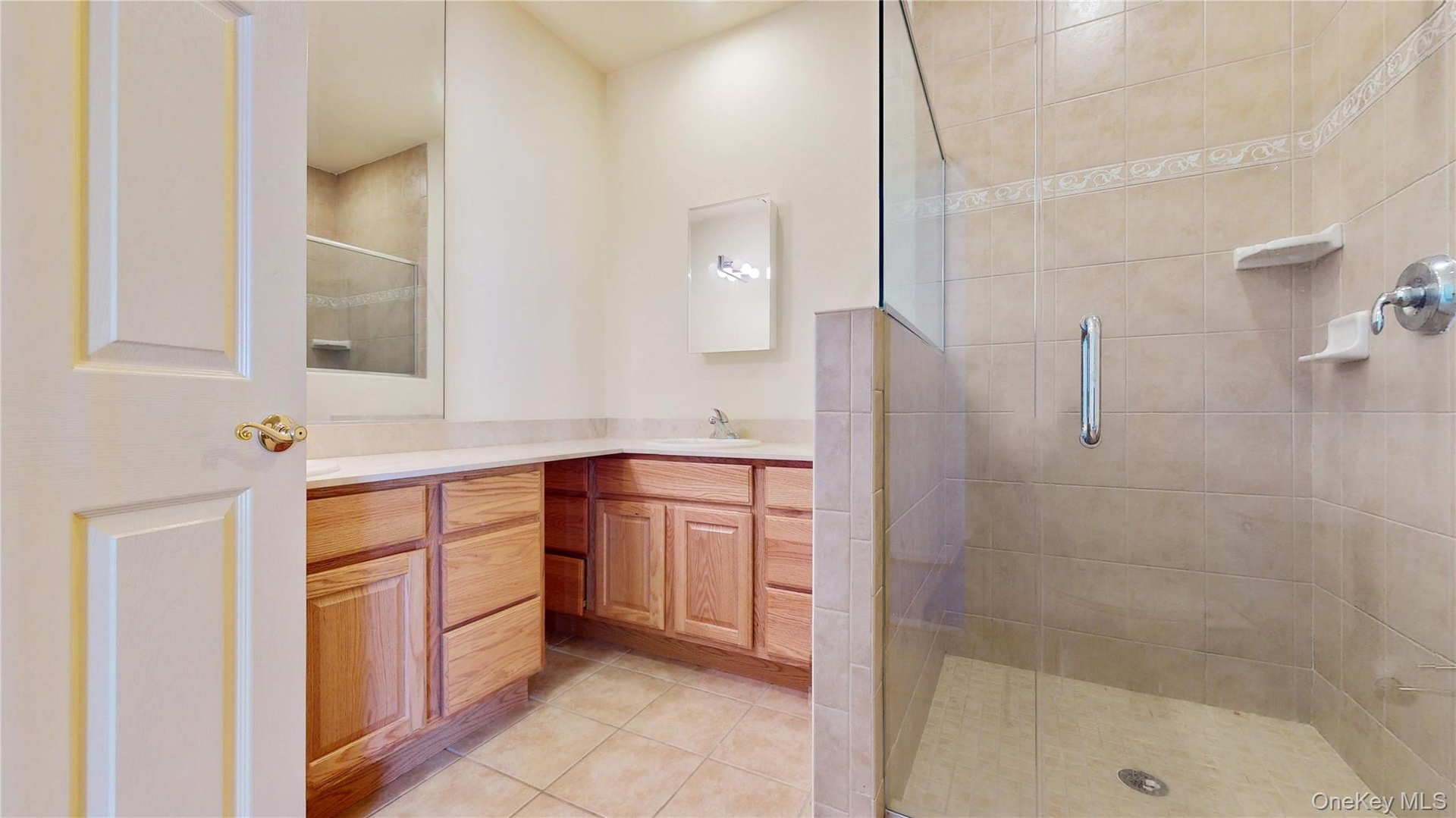 - Full bath featuring a shower stall, double vanity, and tile patterned floors