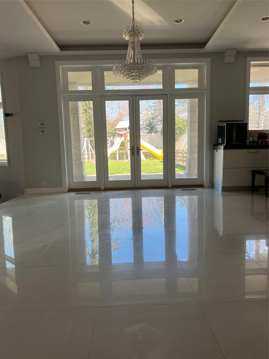 - Unfurnished dining area featuring tile patterned flooring, a raised ceiling, and french doors
