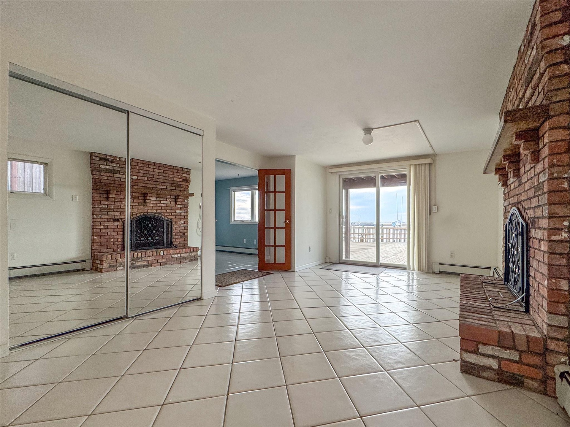 - Unfurnished living room featuring light tile patterned flooring, a brick fireplace, a baseboard heating unit, and baseboards