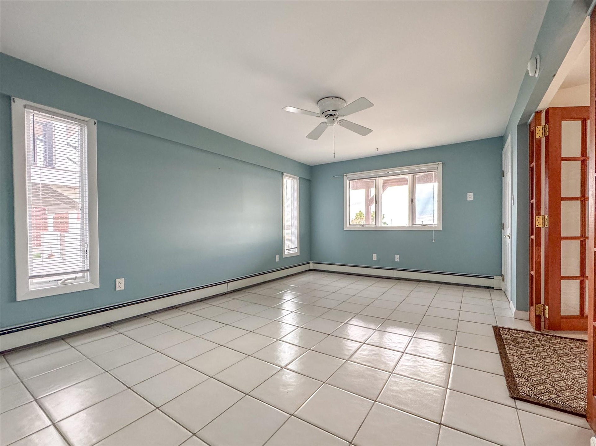- Empty room featuring a baseboard heating unit, light tile patterned floors, a ceiling fan, baseboard heating, and baseboards