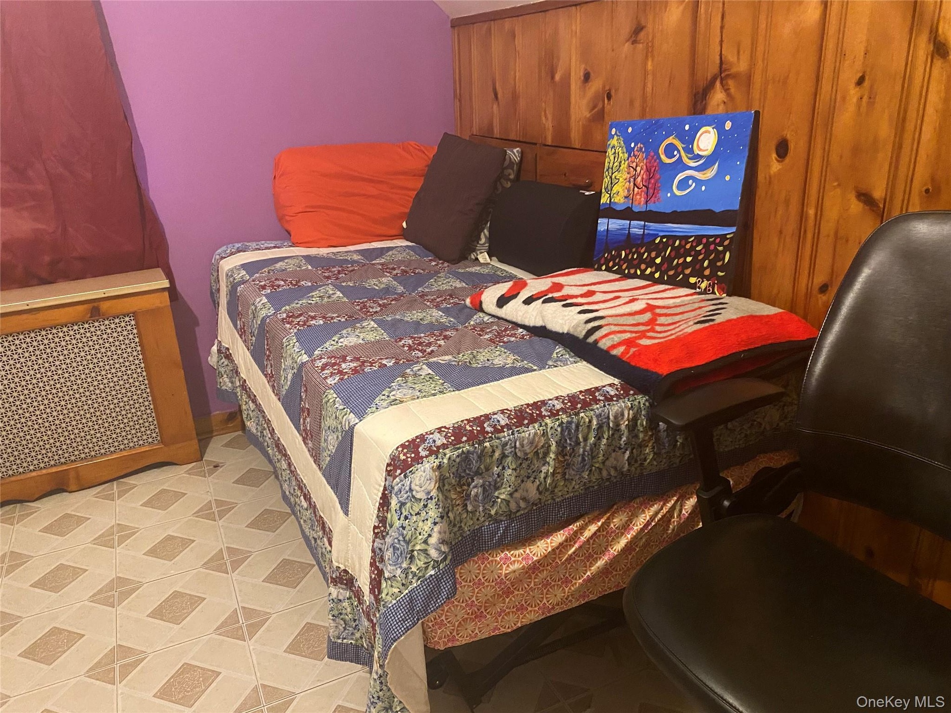 - Bedroom featuring a wainscoted wall, light tile patterned floors, baseboard heating, and wood walls